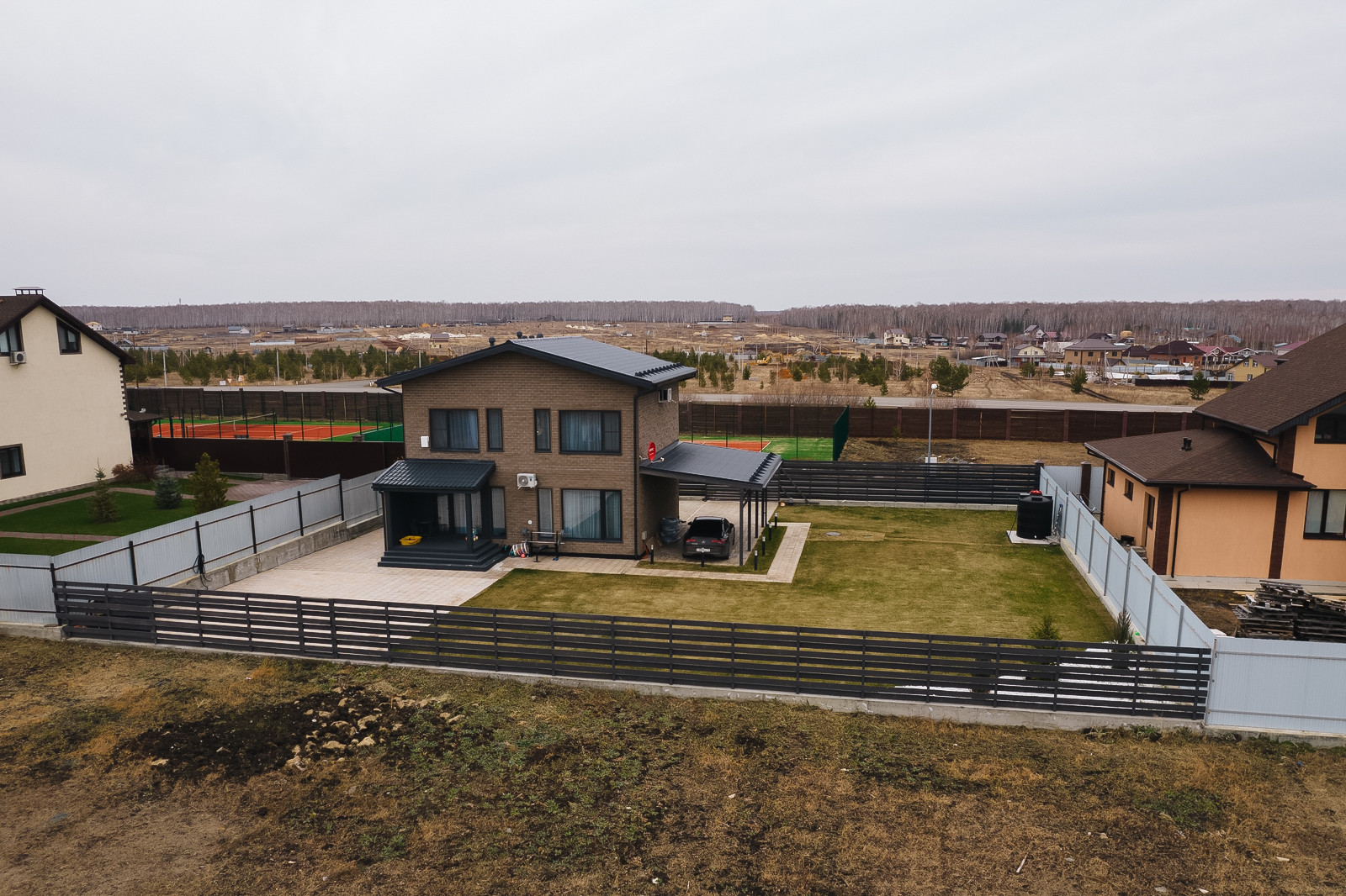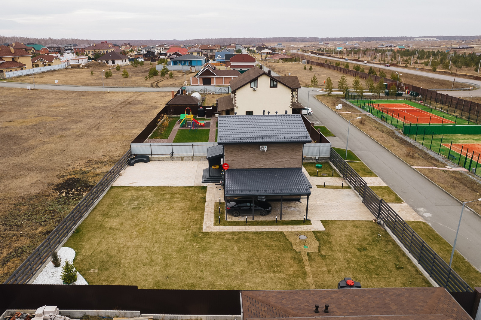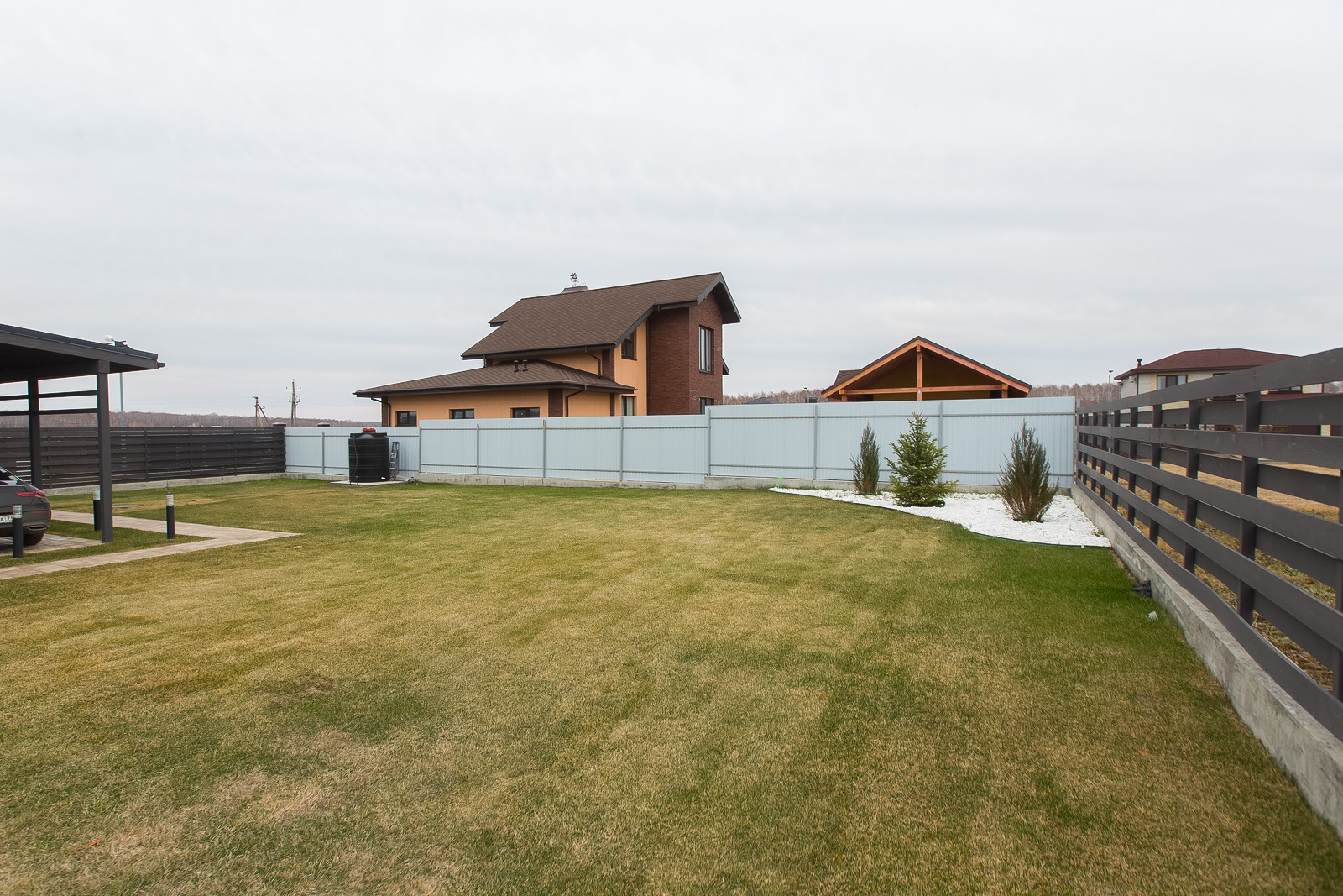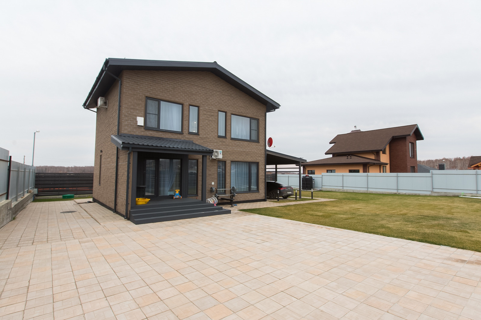 Вокруг дома выровнена вся территория, уложена плитка. На террасе сделаны выводы для бани. Свободное место покрыто газоном с автополивом. Есть навес для 2х автомобилей.