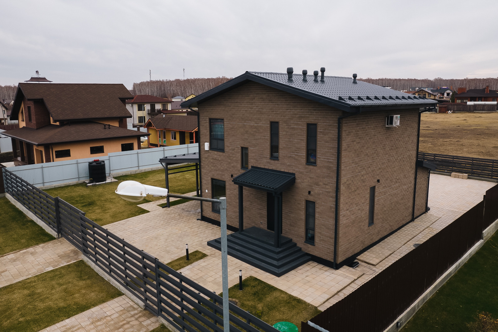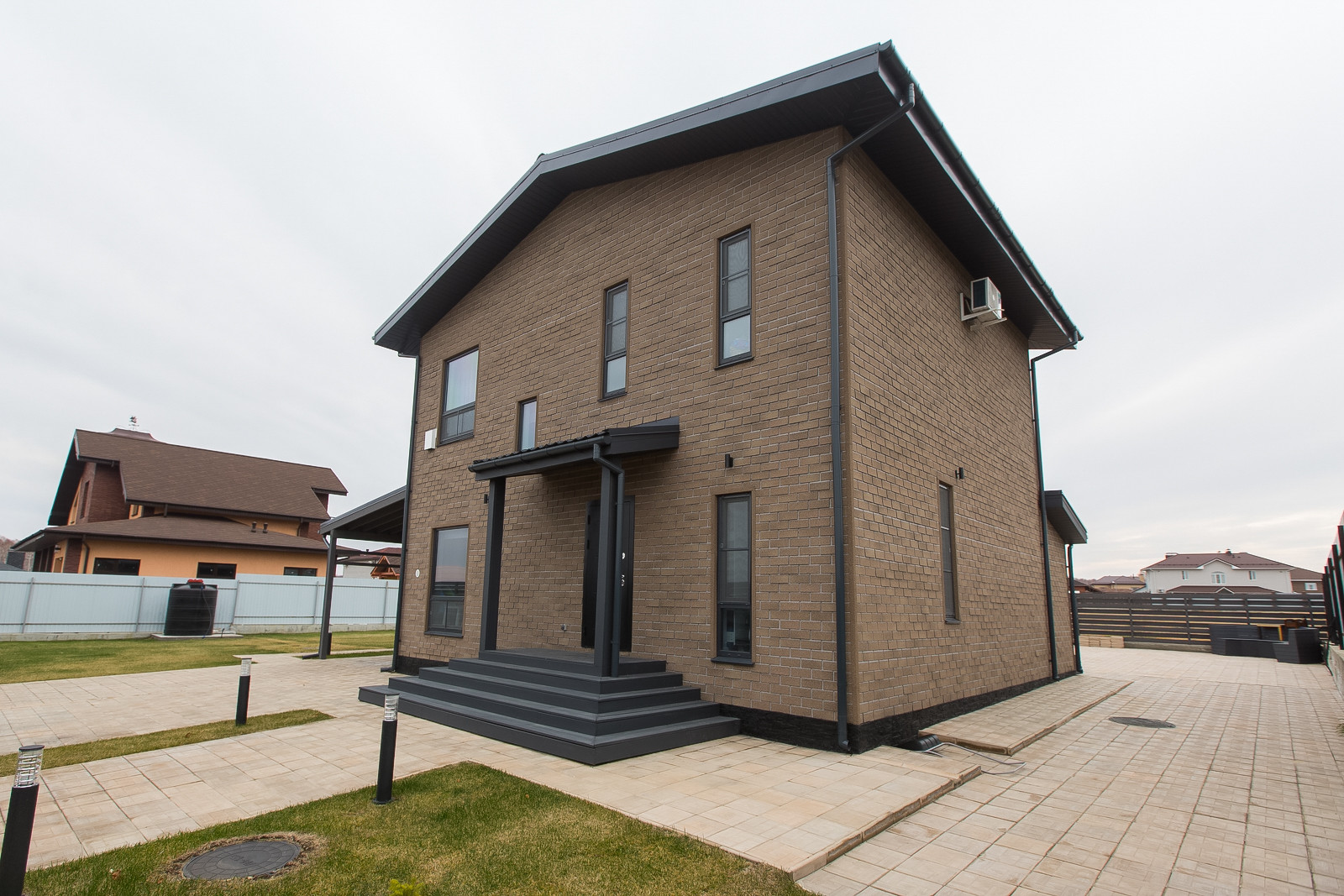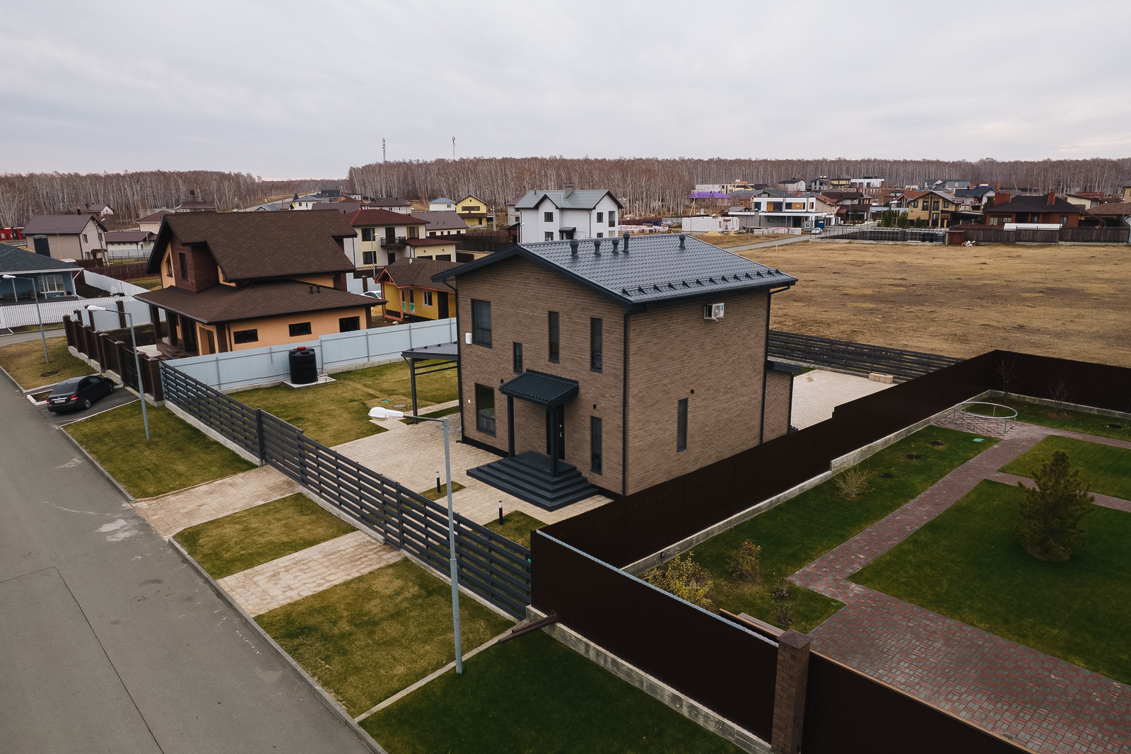 Вокруг дома выровнена вся территория, уложена плитка. На террасе сделаны выводы для бани. Свободное место покрыто газоном с автополивом. Есть навес для 2х автомобилей.