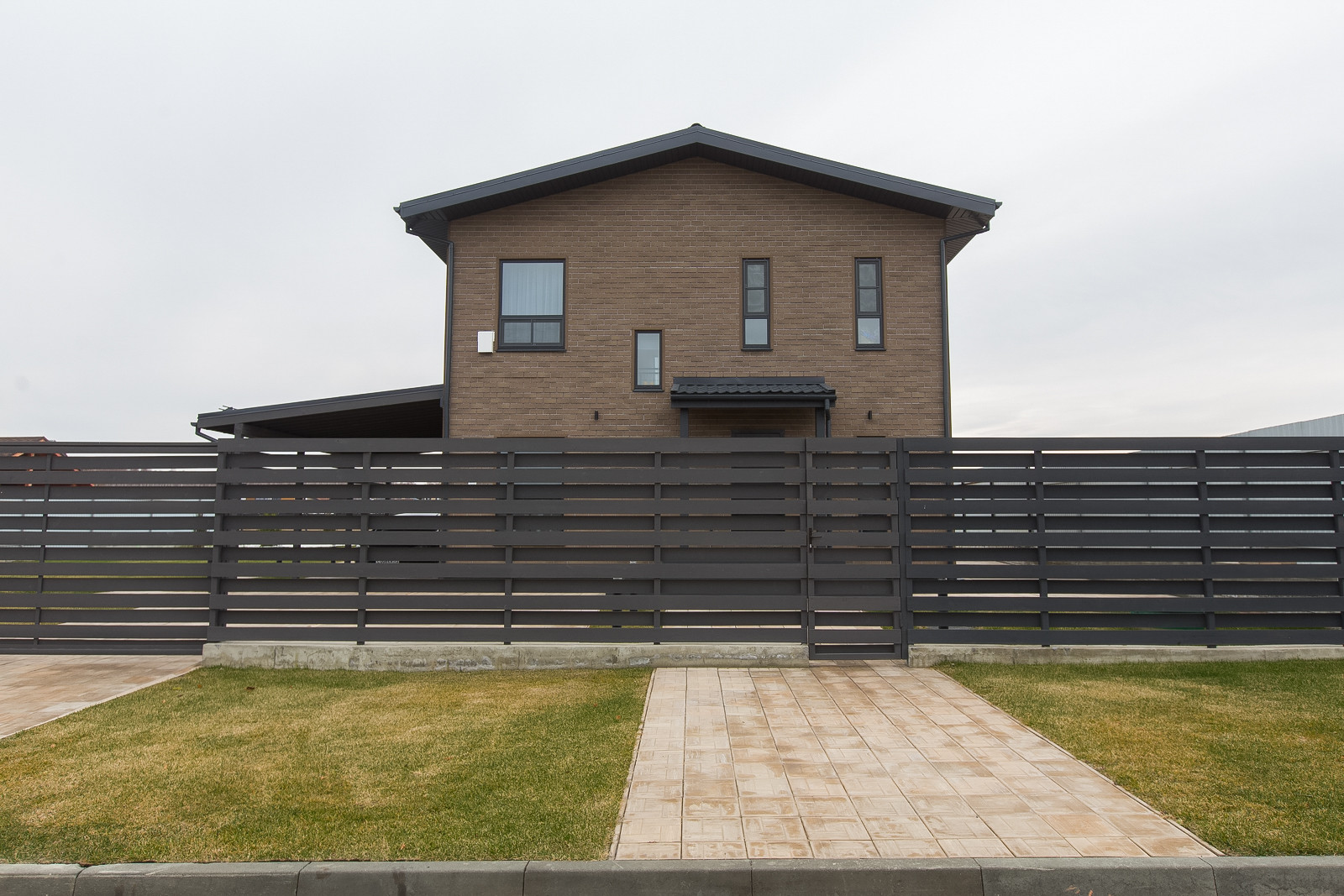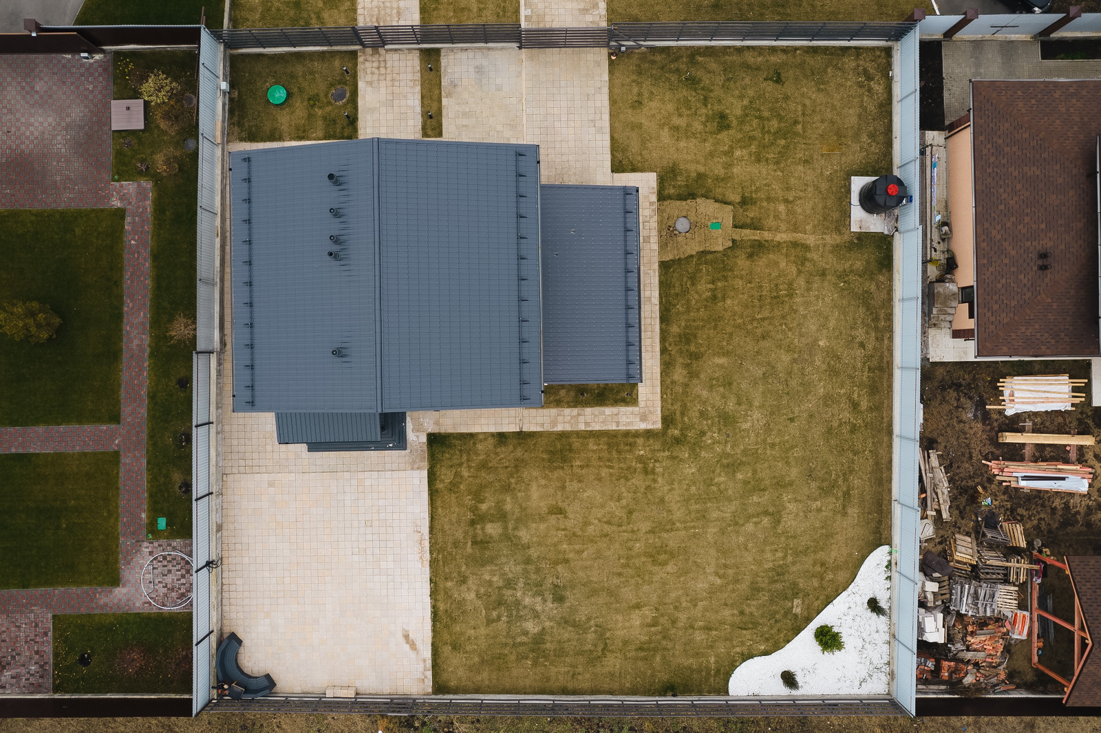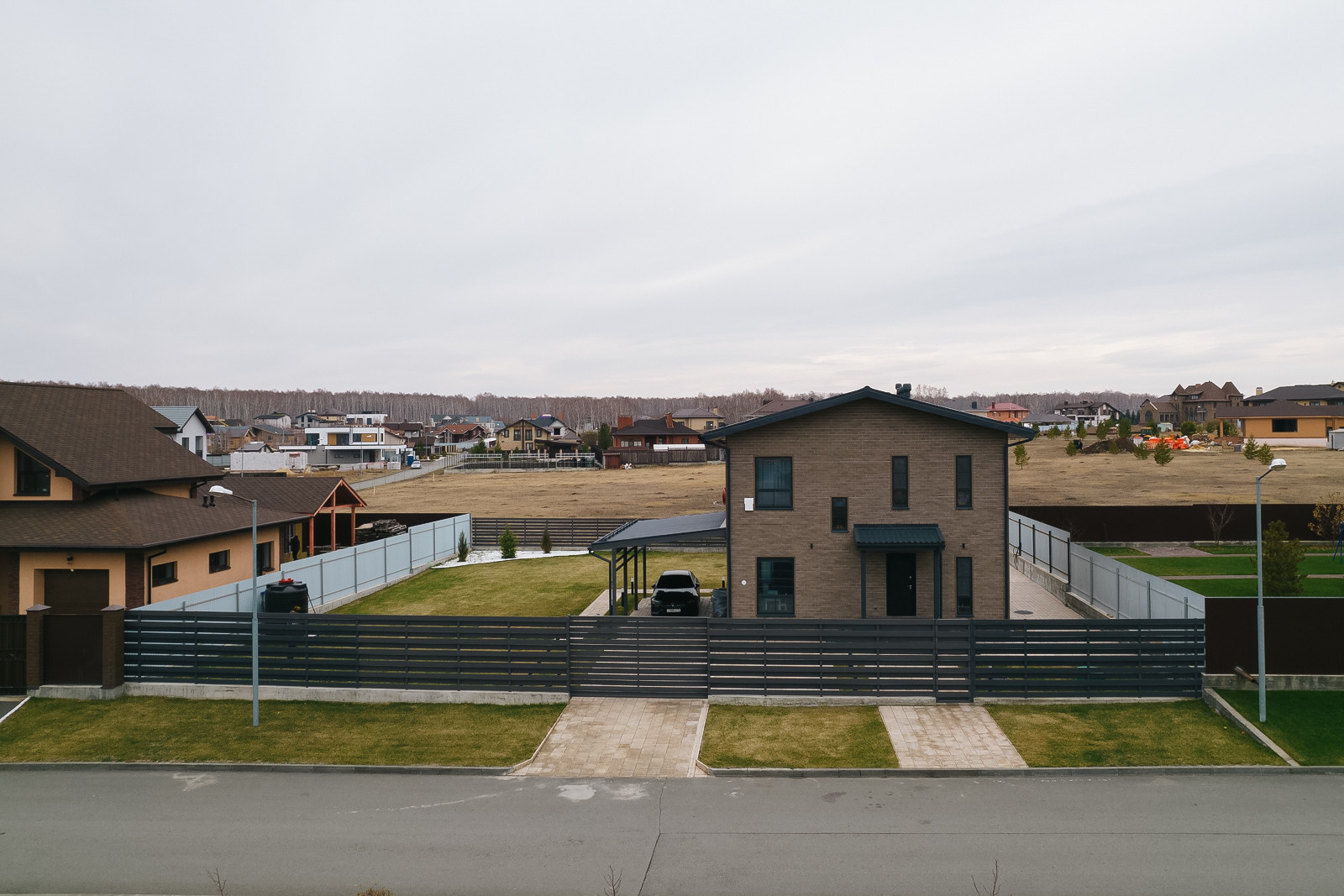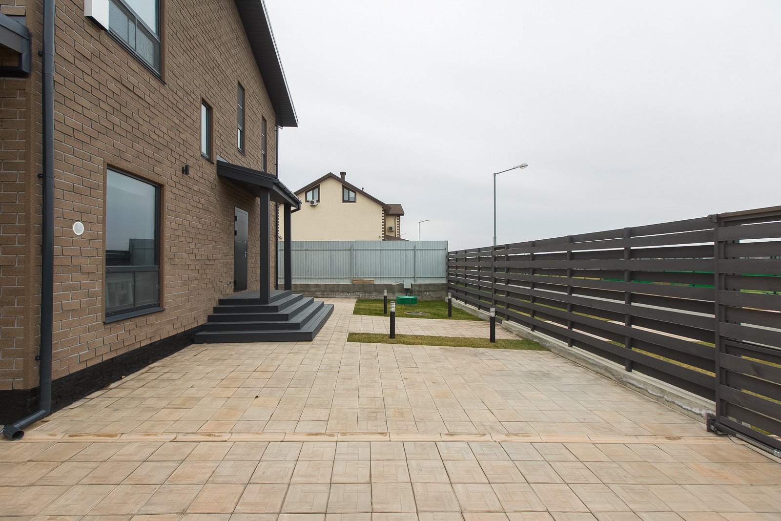 Вокруг дома выровнена вся территория, уложена плитка. На террасе сделаны выводы для бани. Свободное место покрыто газоном с автополивом. Есть навес для 2х автомобилей.