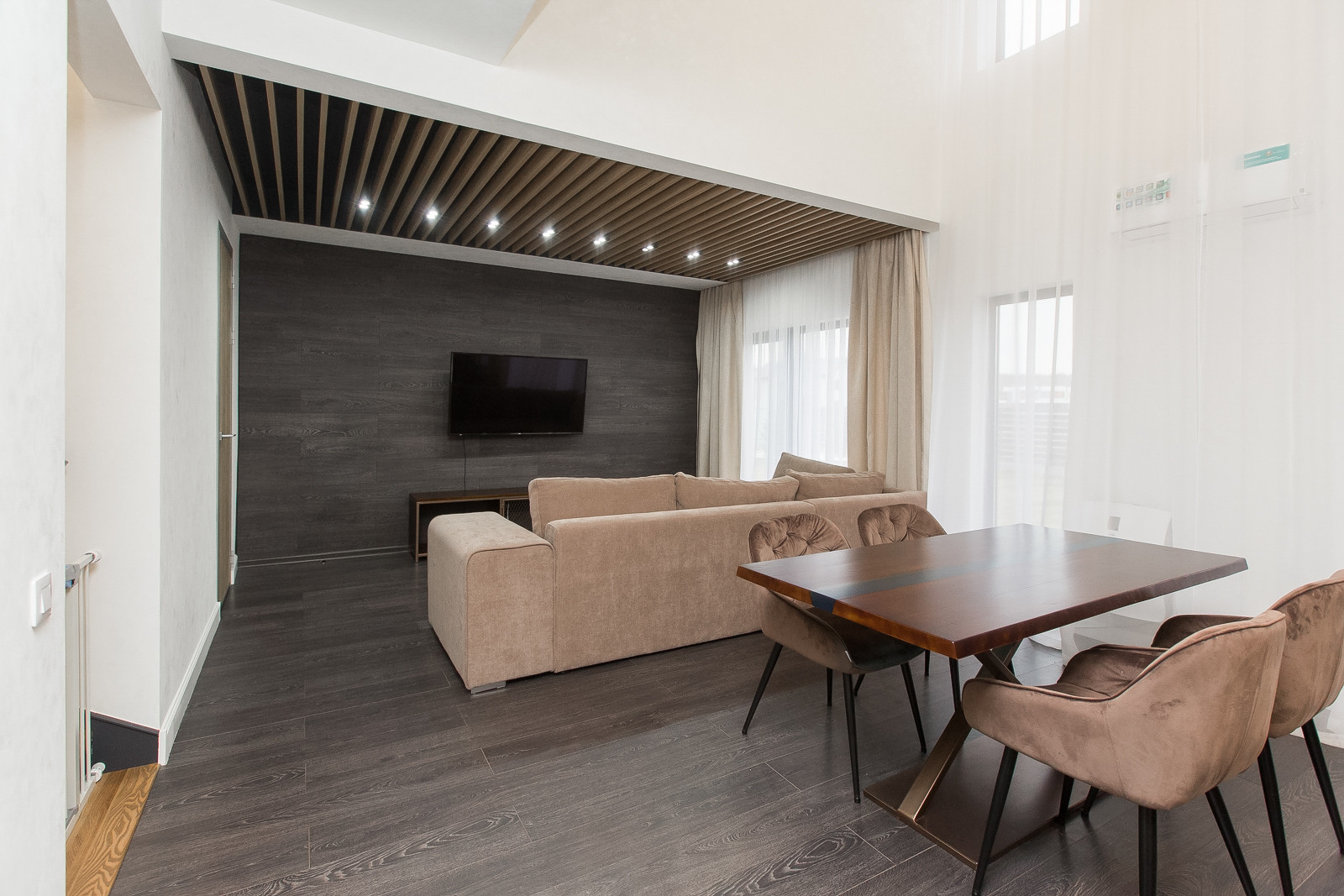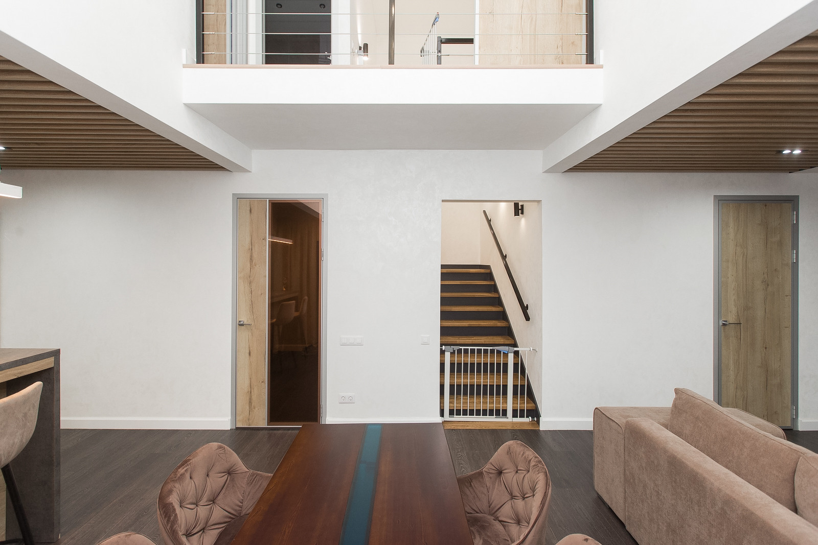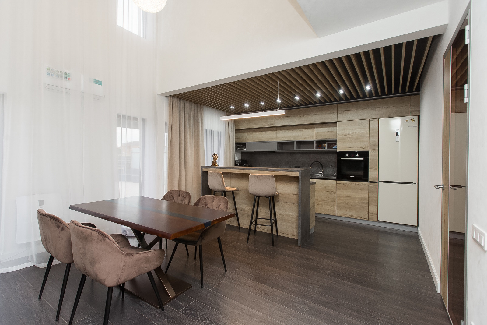 Про дом мы можем рассказывать очень много, но лучше 1 раз увидеть в живую. На 9 сотках земли расположили двухэтажный каркасный дом 132,8 кв.м. На 1 этаже расположили удобную кухню-гостиную с теплым полом, панорамными окнами. Высота потолков 6 метров. Также расположили гостевую комнату, санузел, техническую комнату и гардероб. Между этажами установили удобную лестницу(ясень), как для взрослого, так и для ребенка.