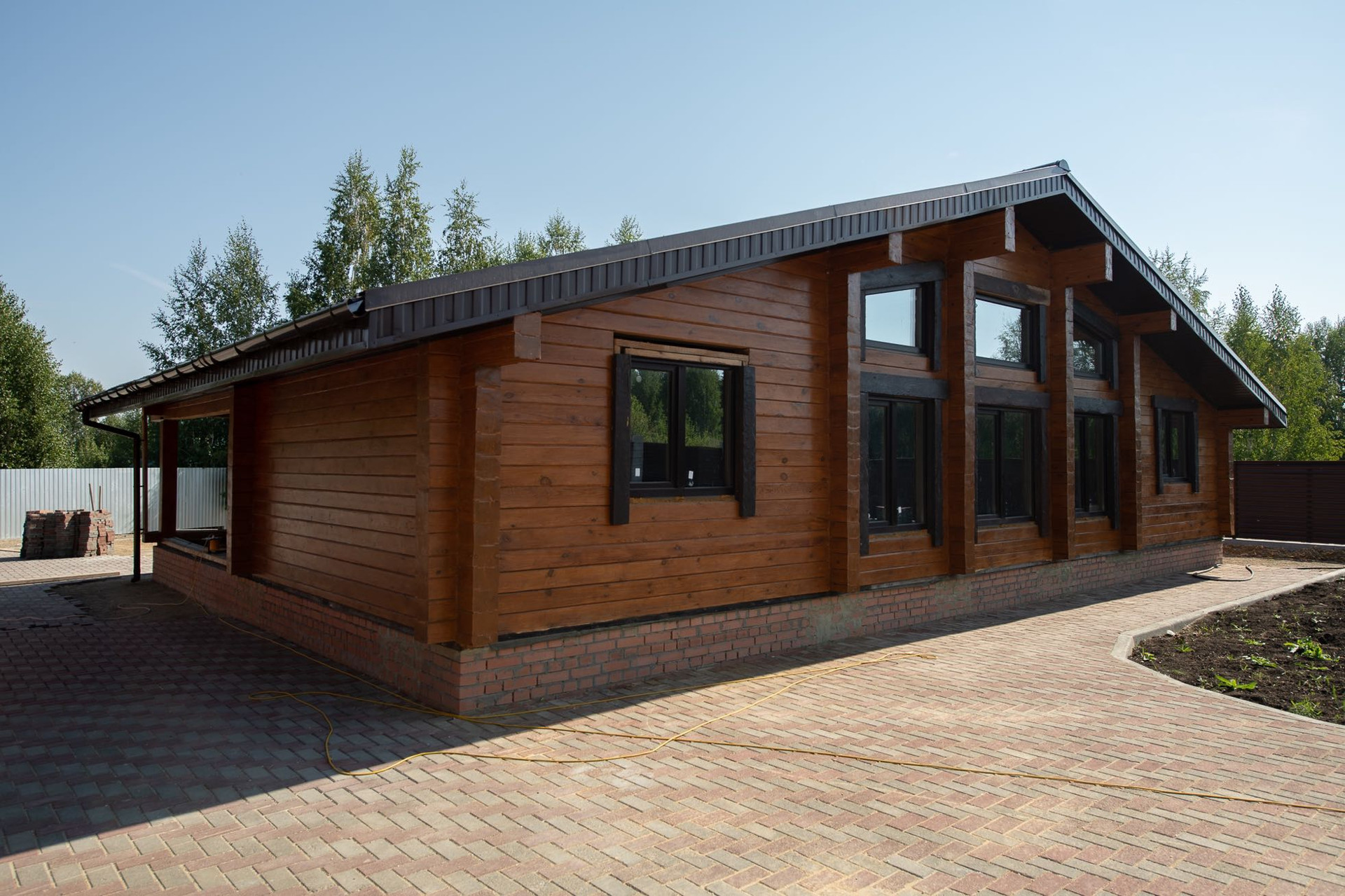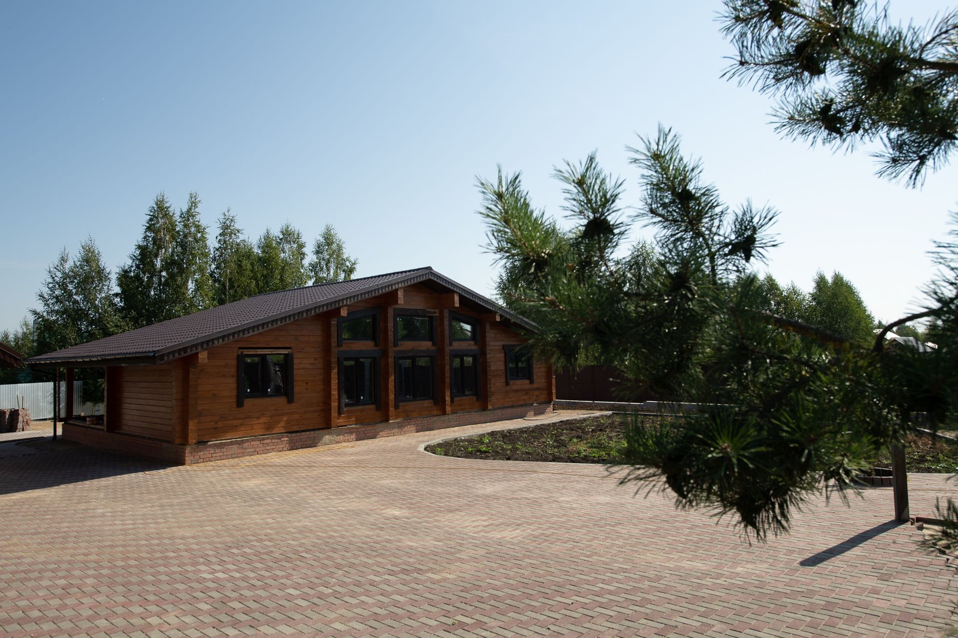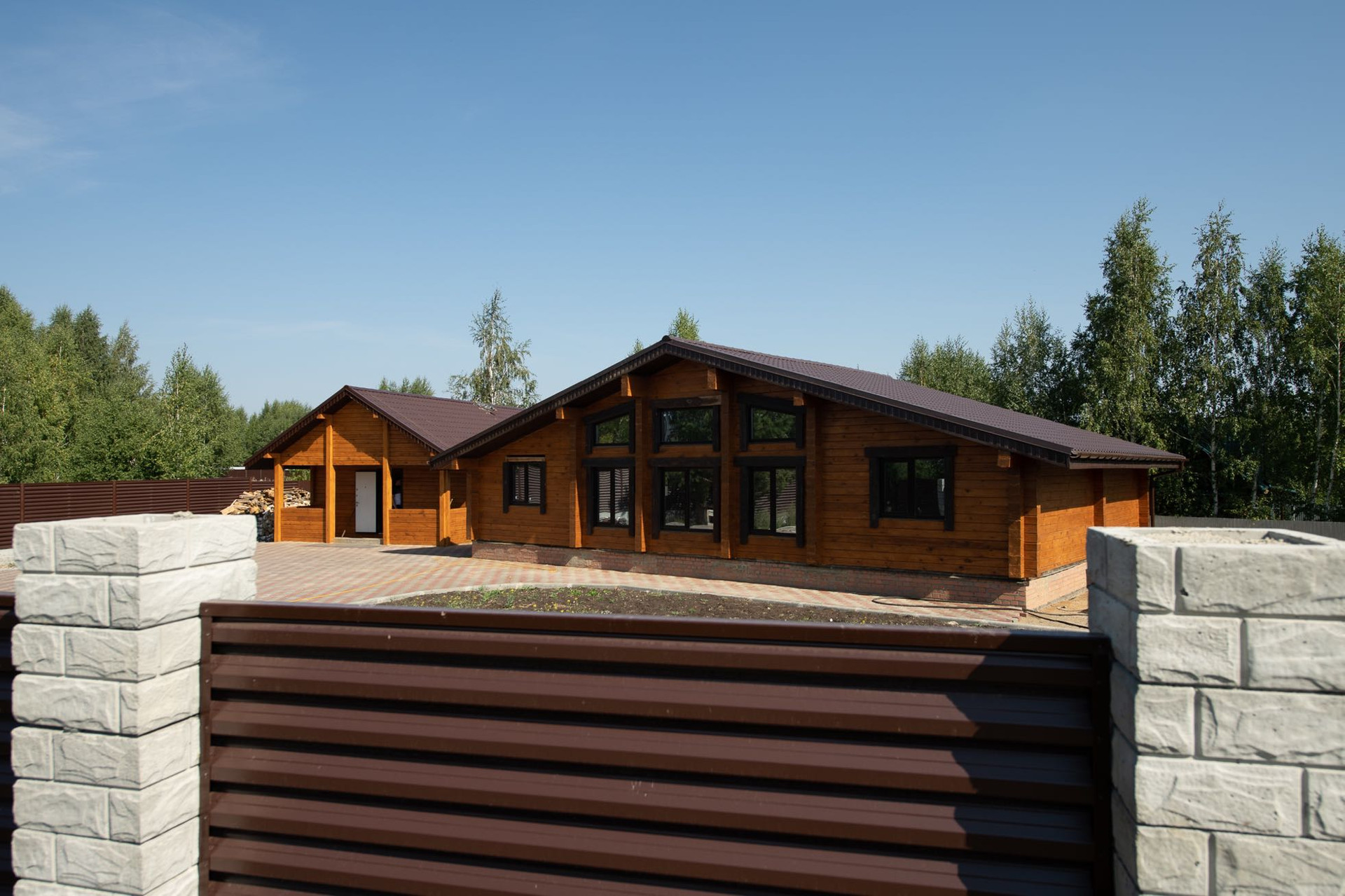 Территория участка полностью выложена брусчаткой, по периметру установлен современный секционный забор жалюзи завода Профсиб!