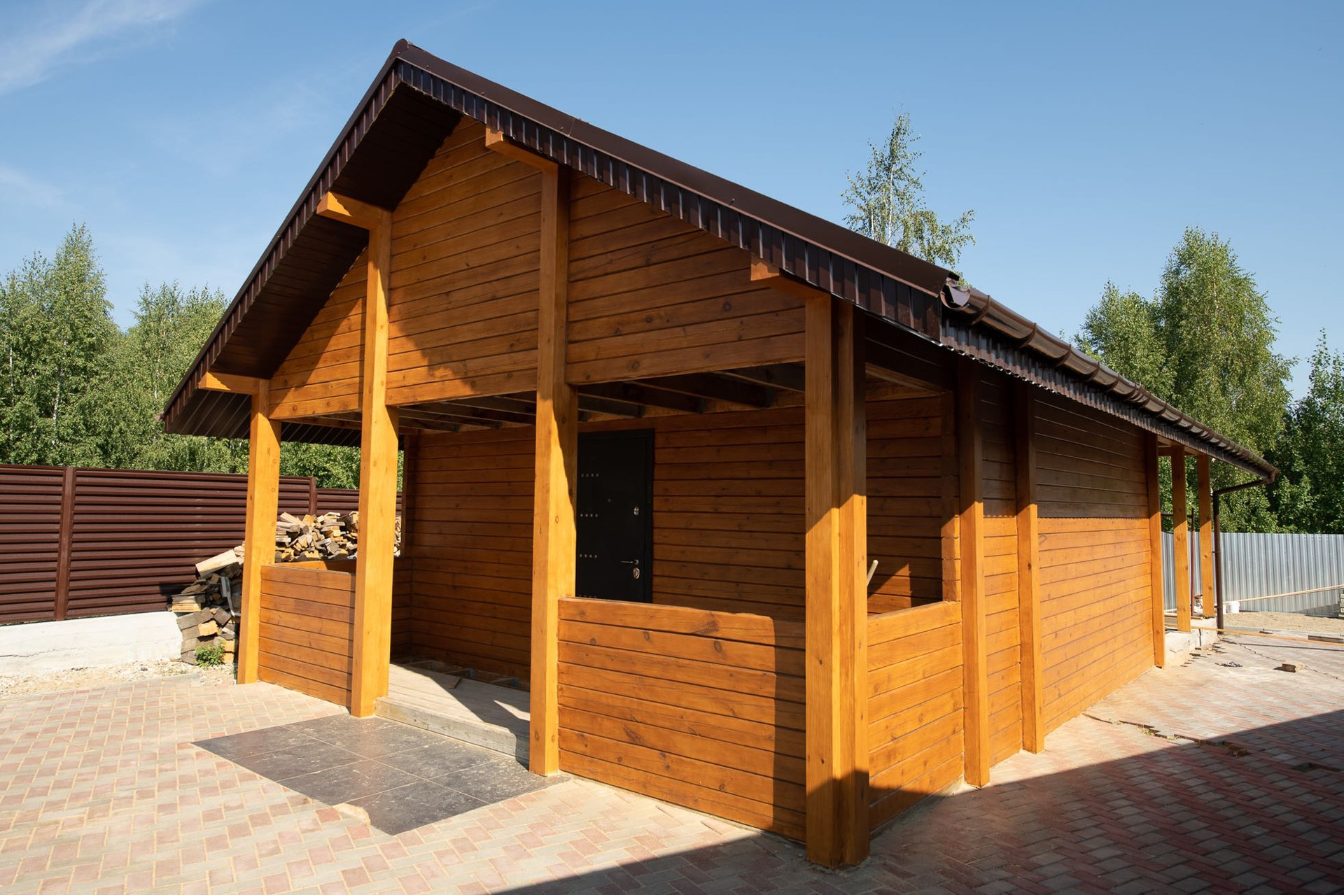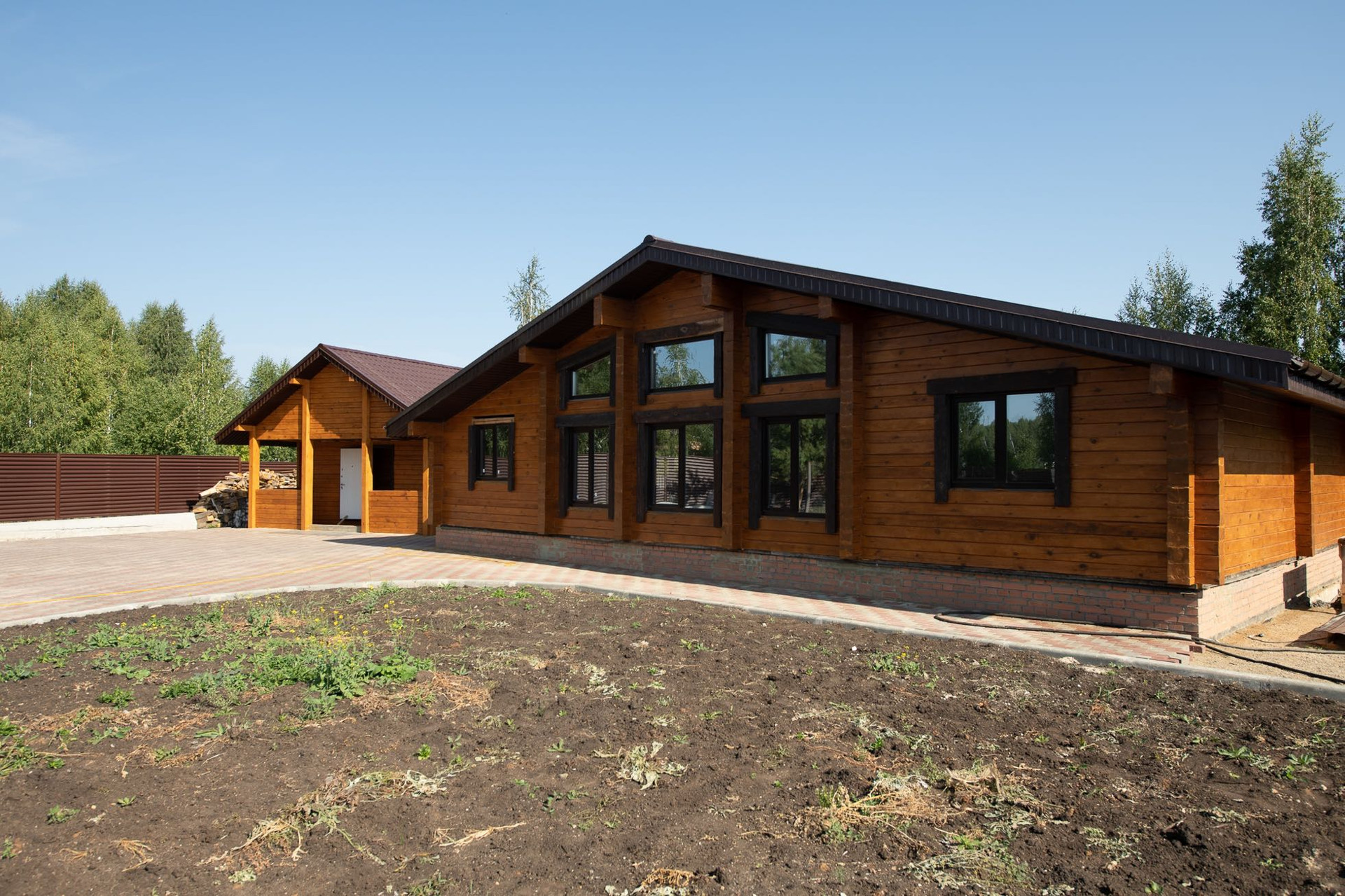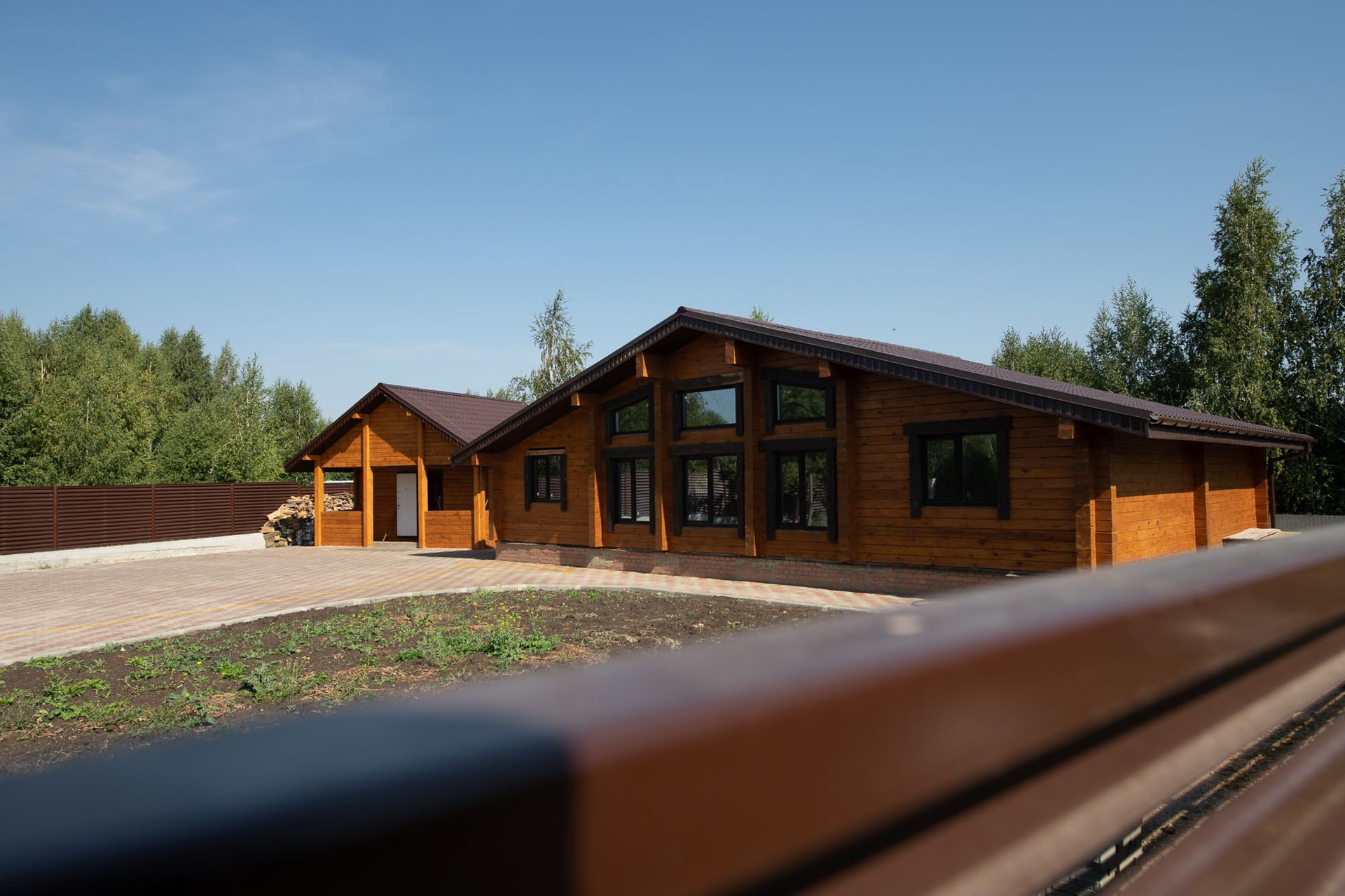 Территория участка полностью выложена брусчаткой, по периметру установлен современный секционный забор жалюзи завода Профсиб!