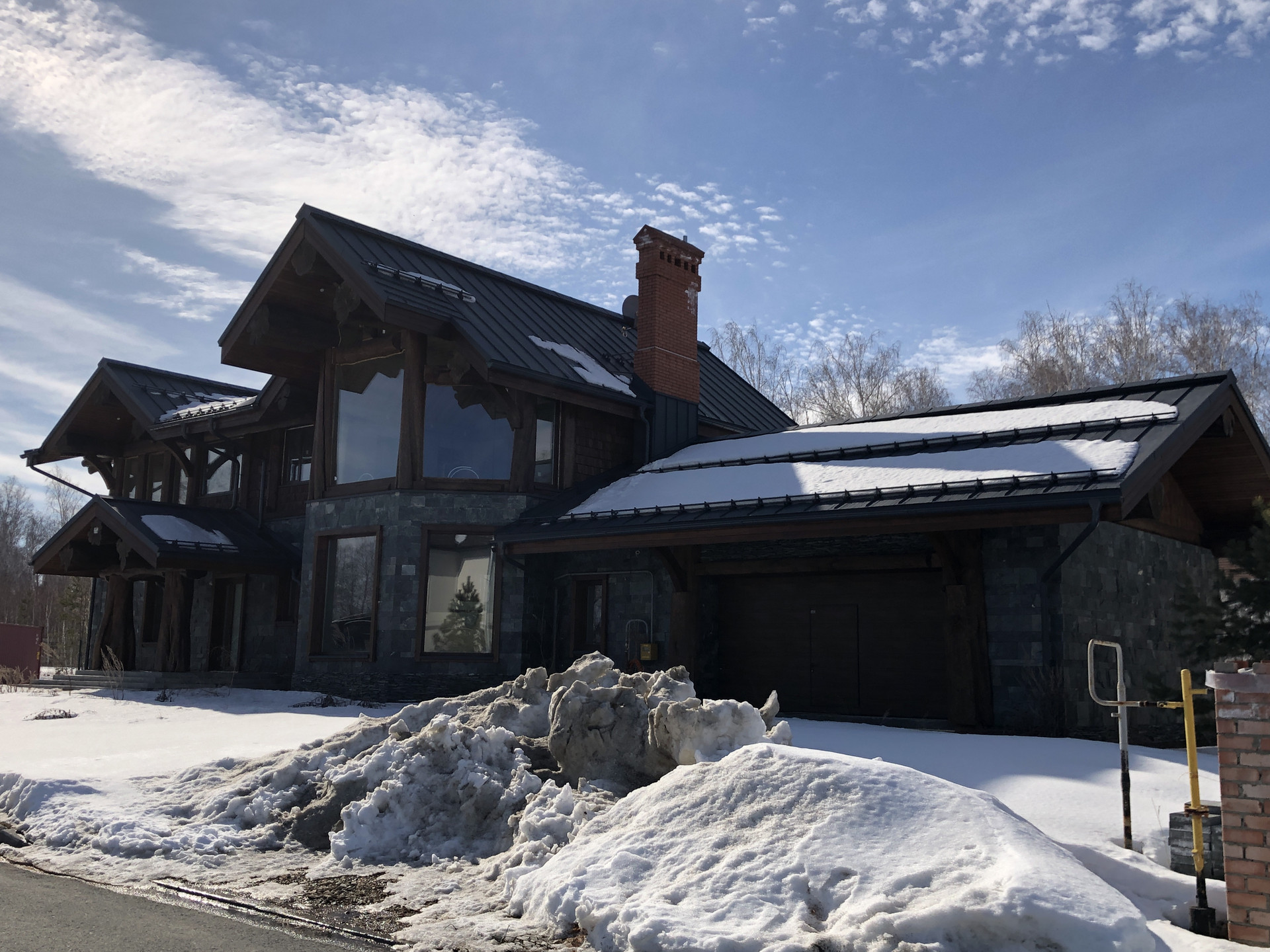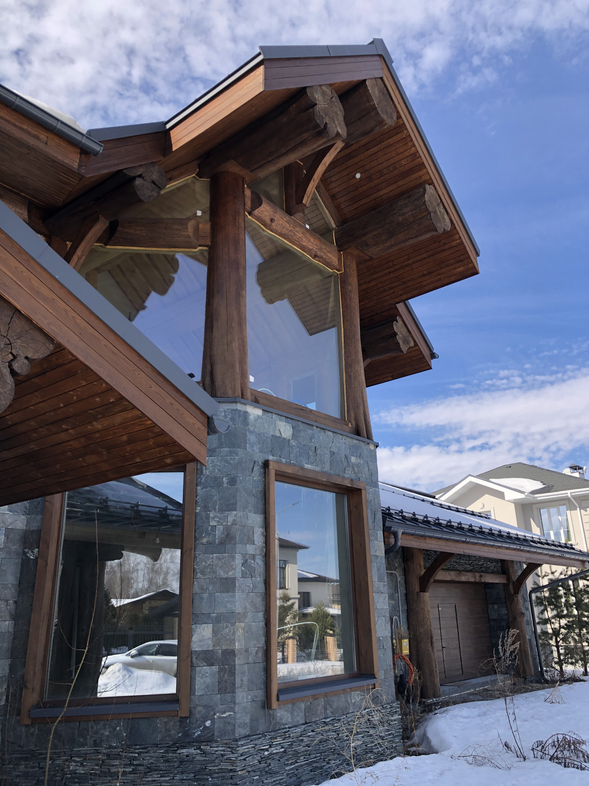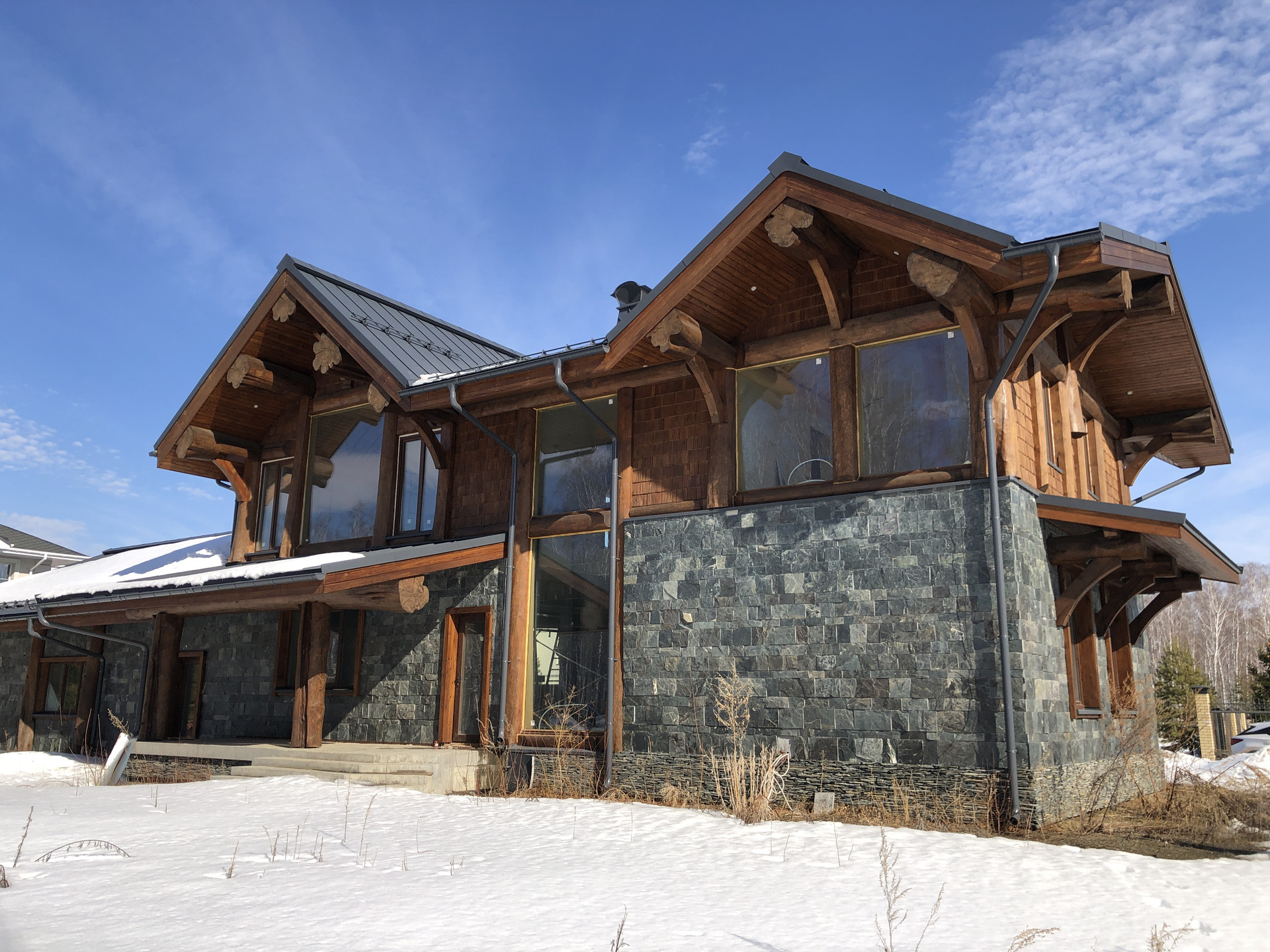 - стены наружные: 1ый эт. - керамический блок КЕММА с утеплителем, облицовка натуральный камень, 2ой эт. бревно D50см и калёное стекло;