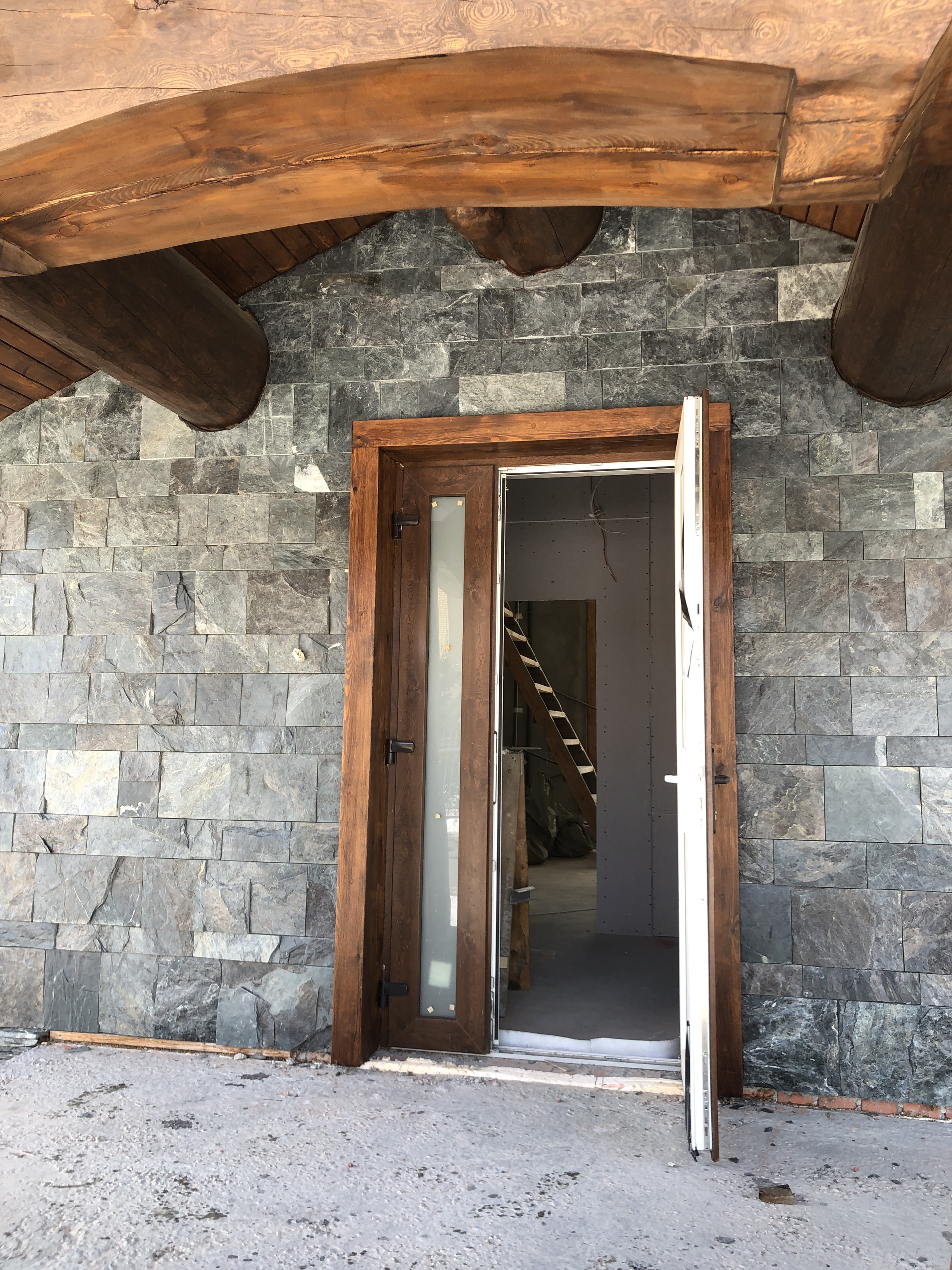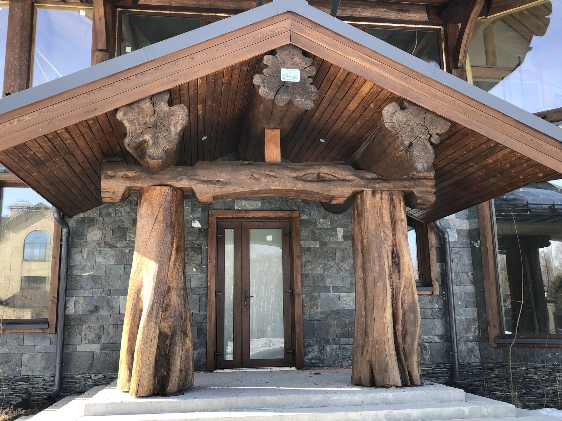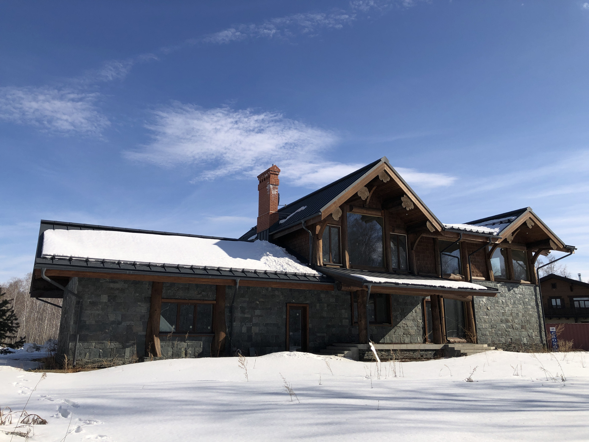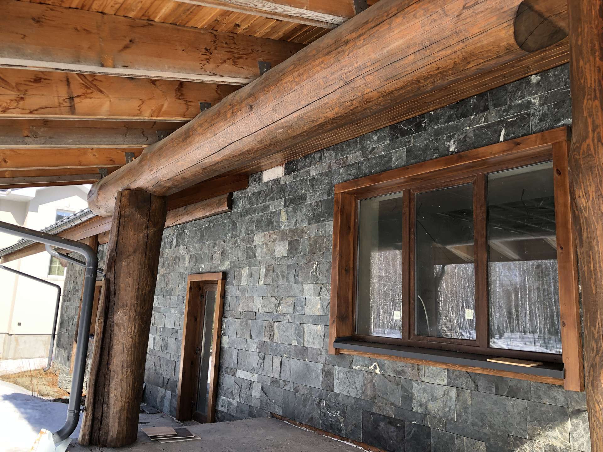 - стены наружные: 1ый эт. - керамический блок КЕММА с утеплителем, облицовка натуральный камень, 2ой эт. бревно D50см и калёное стекло;