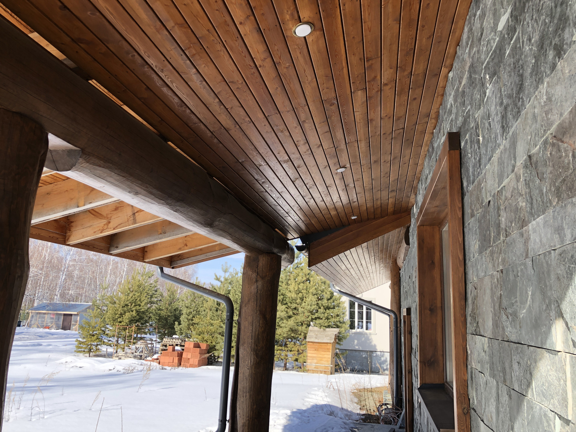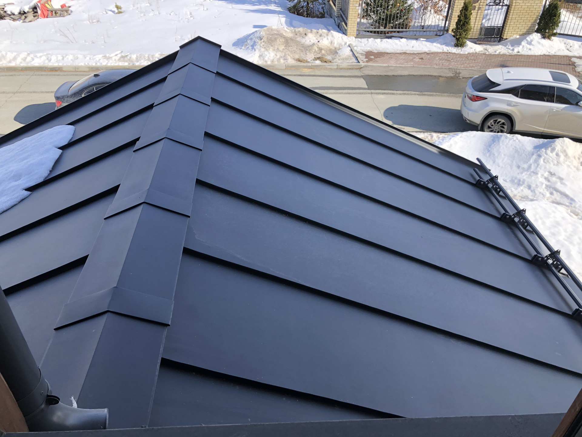 - кровля: металл фальцевой - финская сталь «Ruuki pural matt RR23», разделительный слой - немецкая мембрана «Delta Roof», крепеж нержавеющий от австрийской компании «Prefa», пароизоляция и гидроизоляция от немецкой компании «Delta», также установлены водосточка и снегоудержание.