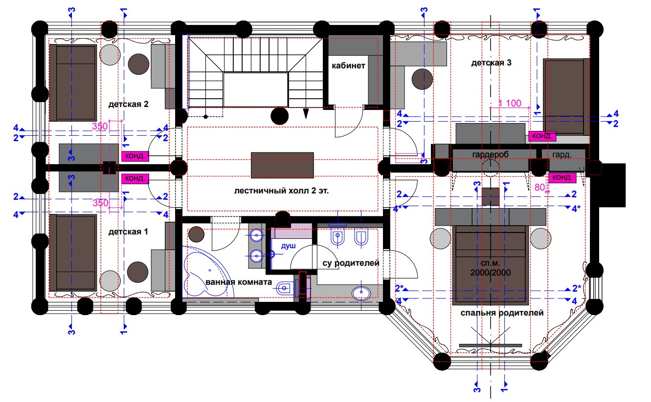 2-ой этаж: холл - 18м2, кабинет – 3м2; 3-и детские – 15, 15 и 18м2; ванная комната с с/у – 6м2; мастер-спальня родителей с гардеробом и ванной комнатой – 40м2.
