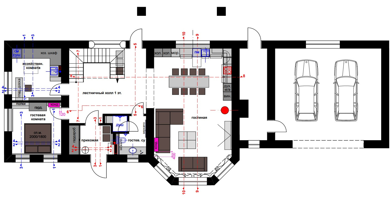 1ый этаж: прихожая, просторный лестничный холл; гостевой с/у; хозяйственная комната – 16м2; гостевая спальня – 16м2; кухня/столовая/гостиная – 50м2; котельная – 15м2; гараж на 2а авто – 50м2.