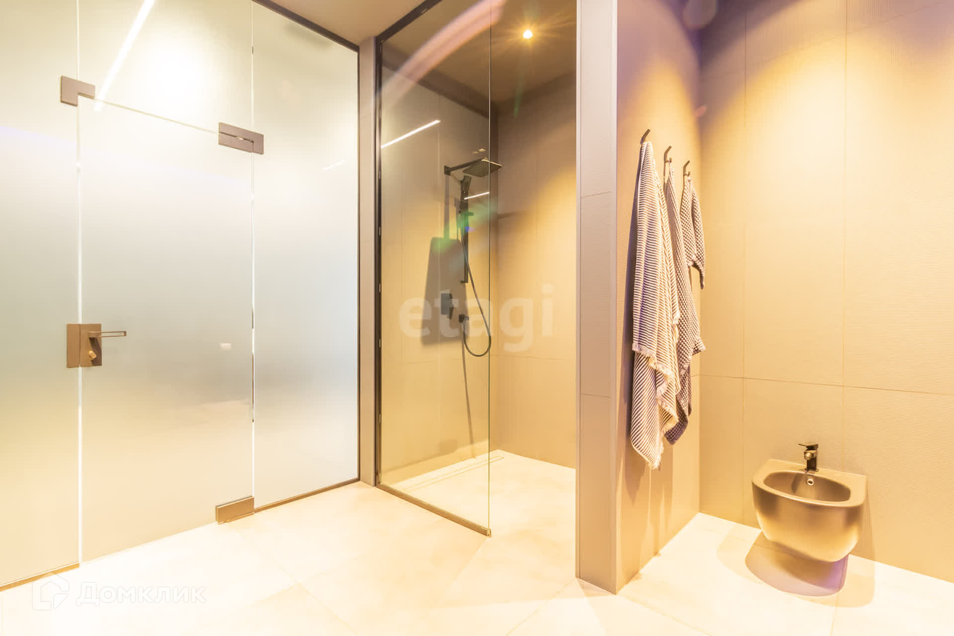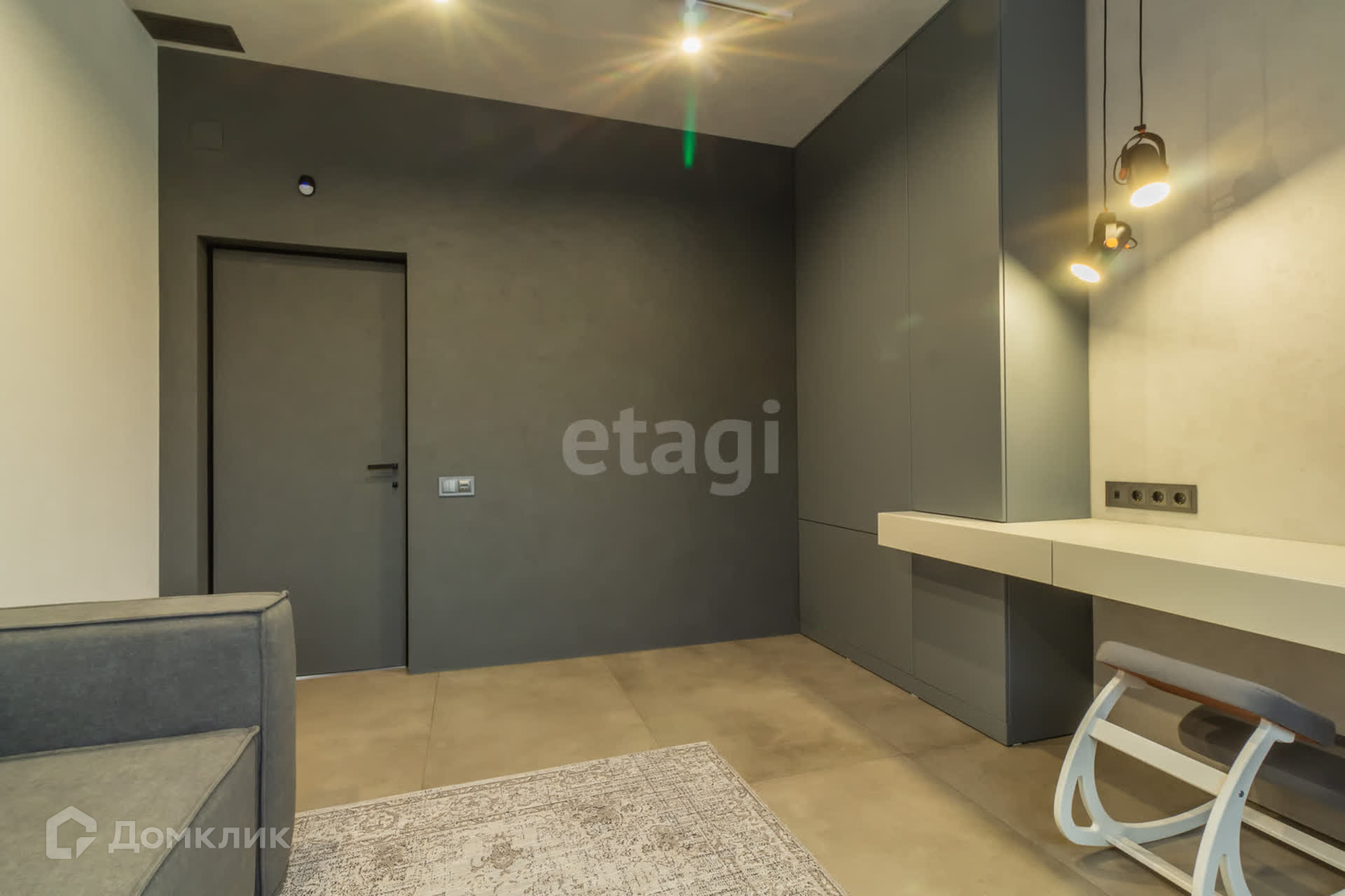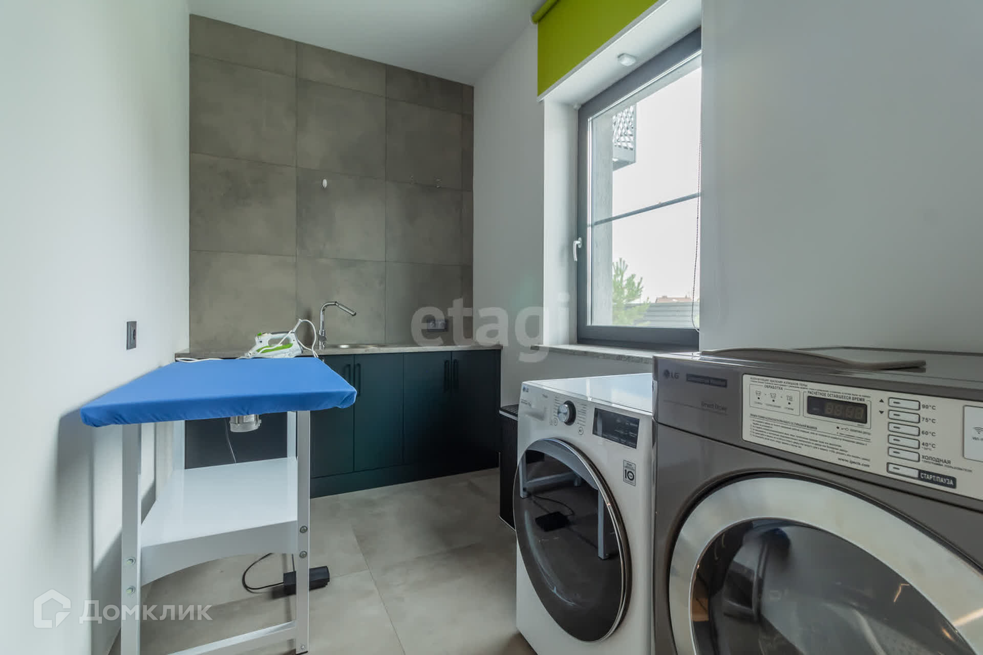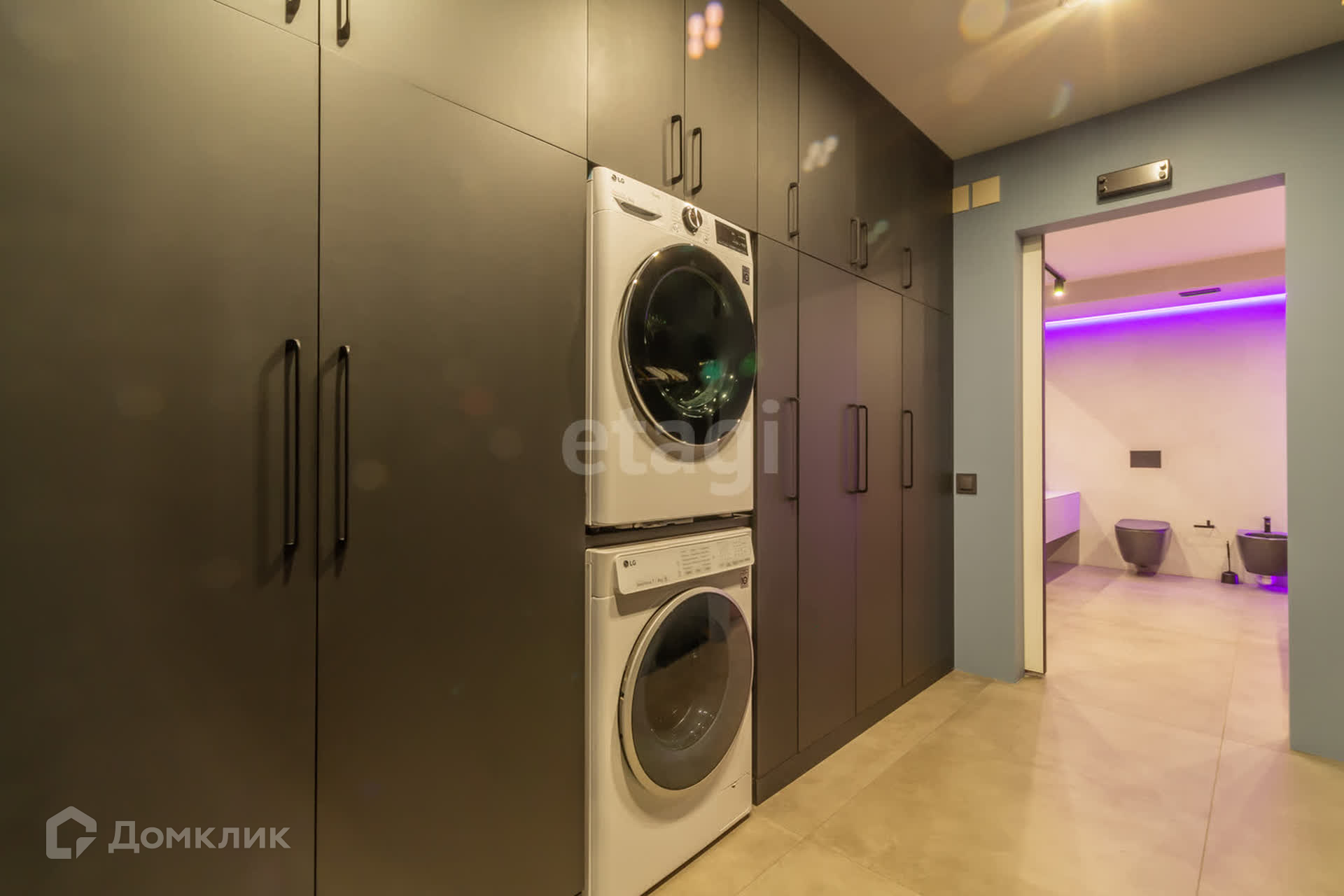 В доме площадью 110 кв. м. имеется кухня-студия, кабинет, спальня, два санузла (один с душем, другой с ванной), гардеробная со стиральной машиной и машиной для сушки белья. Вход в дом из гаража.