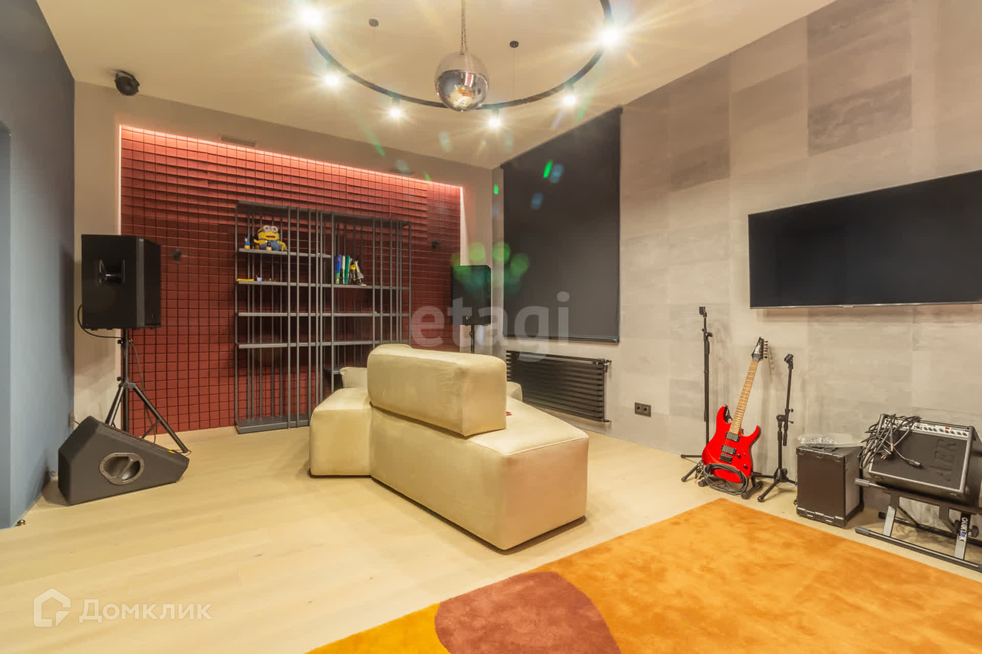 В доме площадью 230 кв. м. имеется кухня-студия, кабинет, спальня, детская комната, два санузла (один с душем, другой с ванной), гардеробная, комната со стиральной машиной и машиной для сушки белья, музыкальная комната и комната-холодильник. Входа в дом два. Один вход из гаража, второй - с территории участка. В зале дома окна с дверью для выхода в сад.