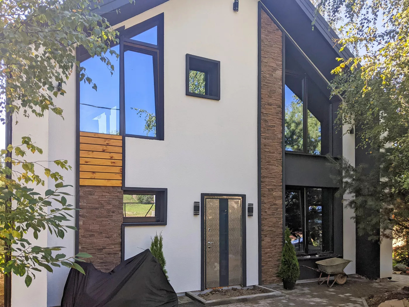 Коммуникации: организация и монтаж систем водоснабжения и канализации, разводка электропроводки по дому. Отделка: Комбинированная: Камешковая штукатурка, Декоративный камень