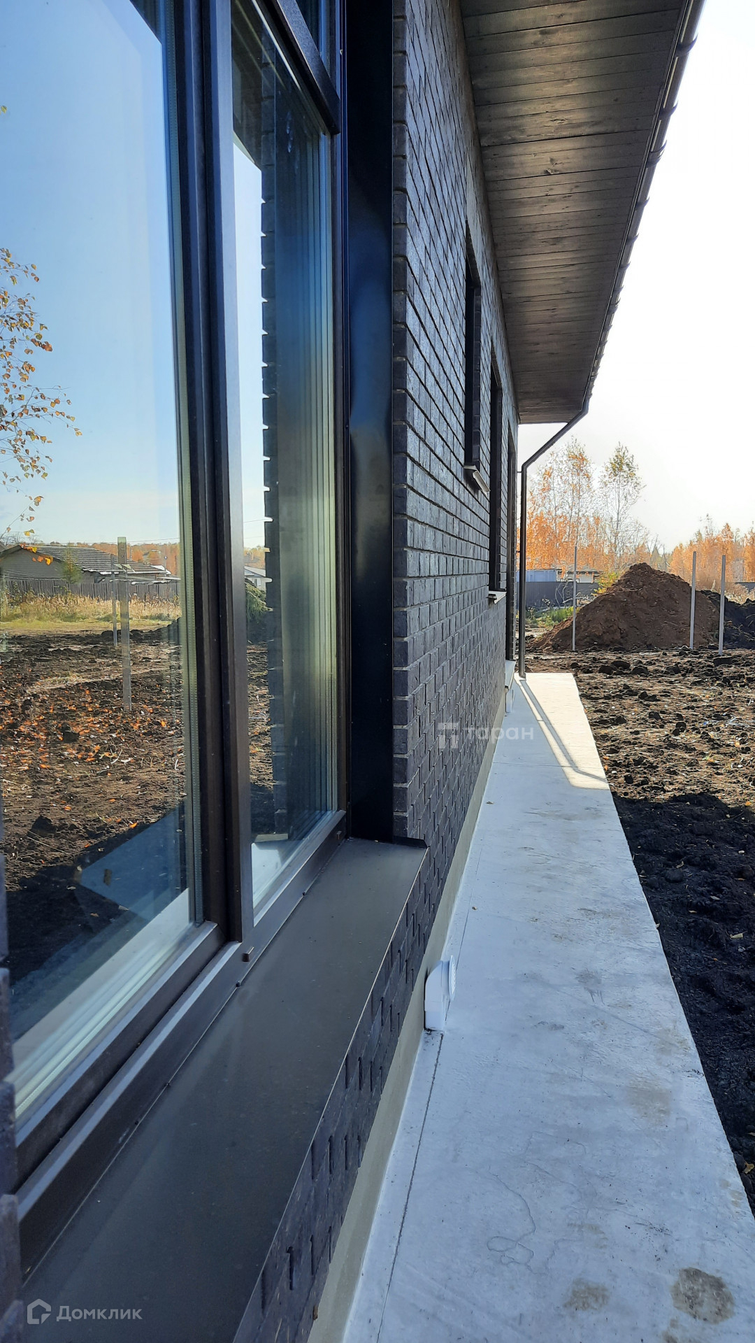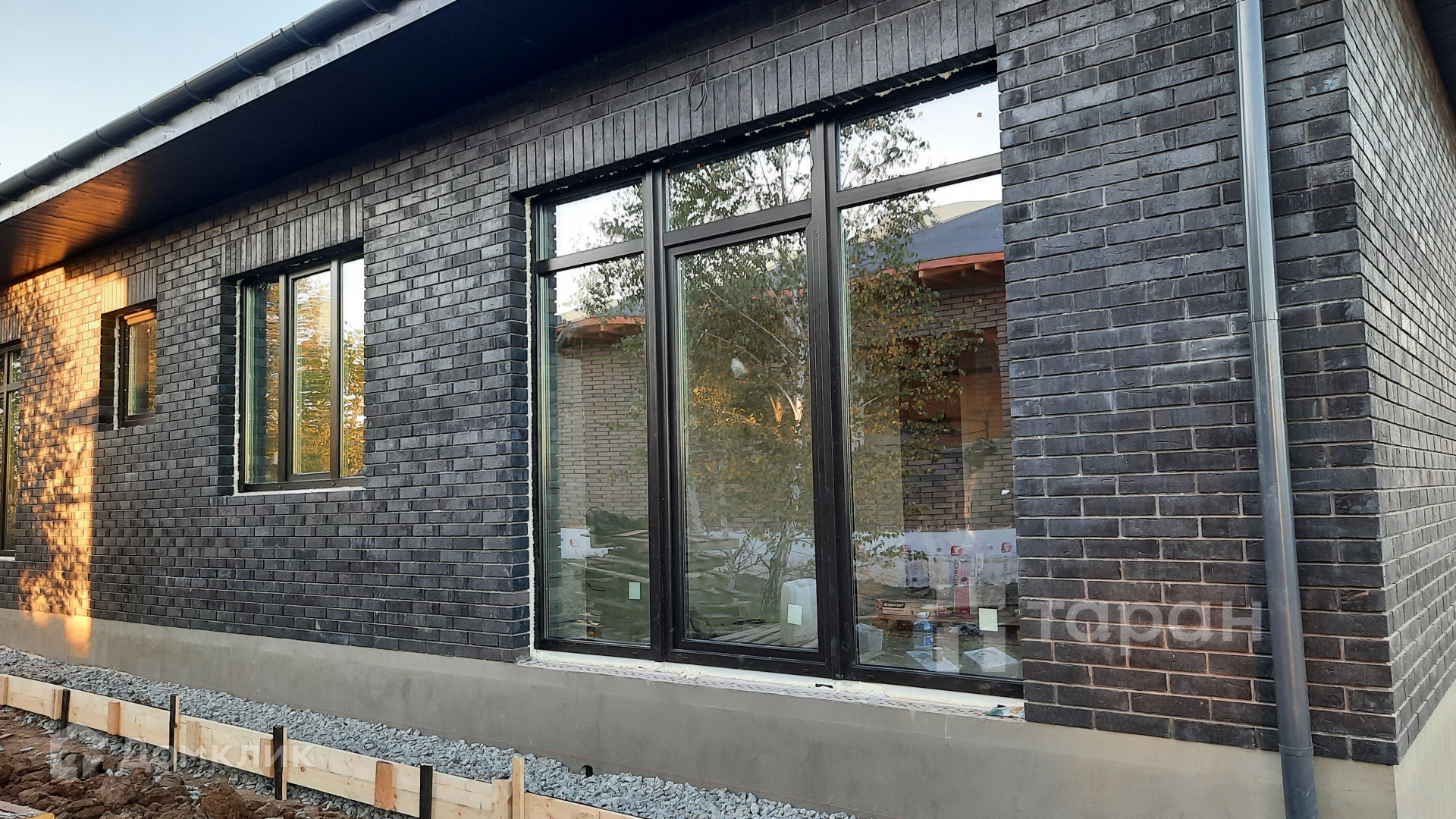 - Окна: Тип окна ПВХ (70мм), 3 стекла, заводская черная ламинация. Панорамное окно + дверь в кухне-гостиной.