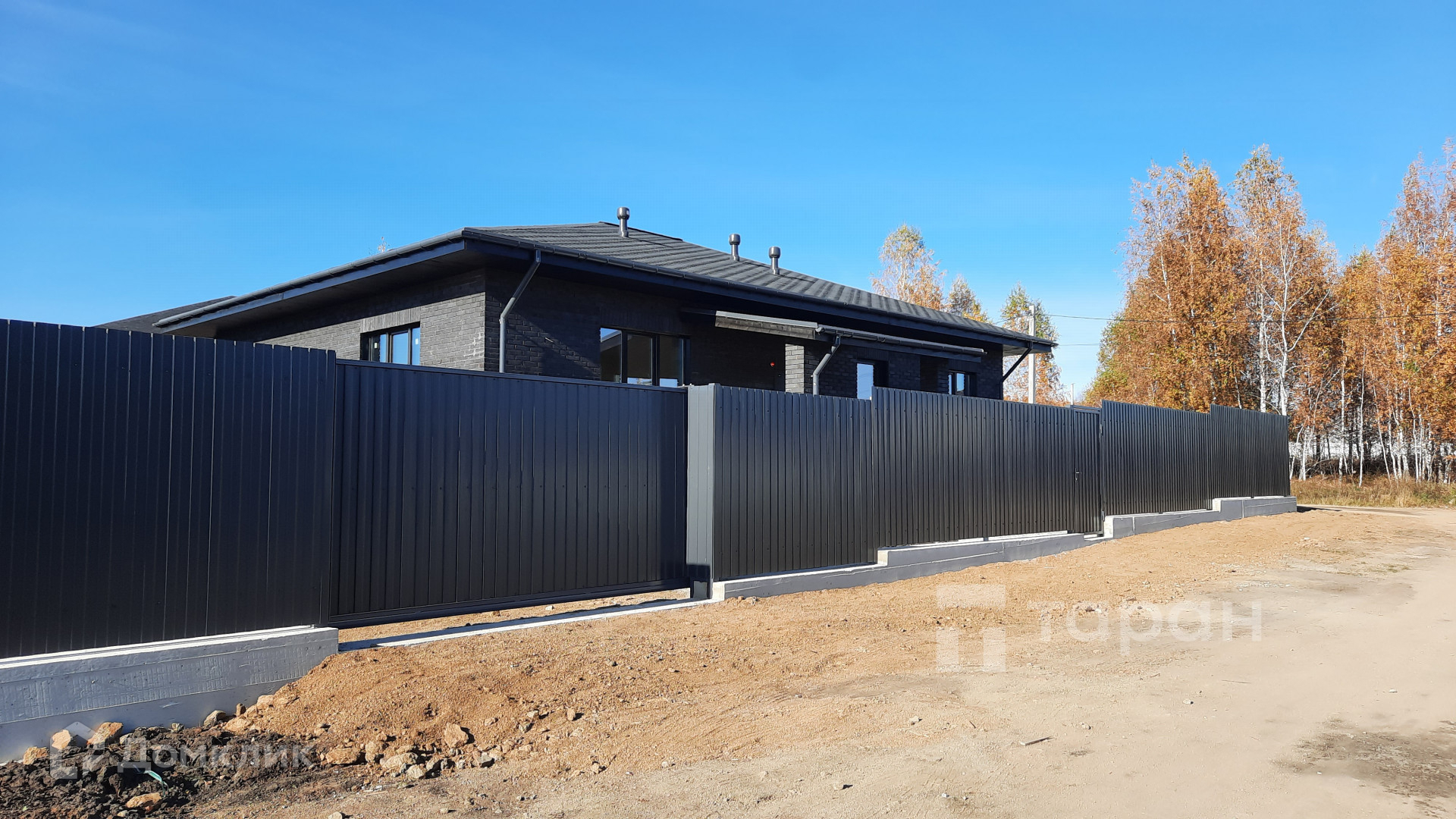 - По периметру участка выполнен фундамент под забор, сам забор из профлиста. Калитка. Ворота откатные автоматические.