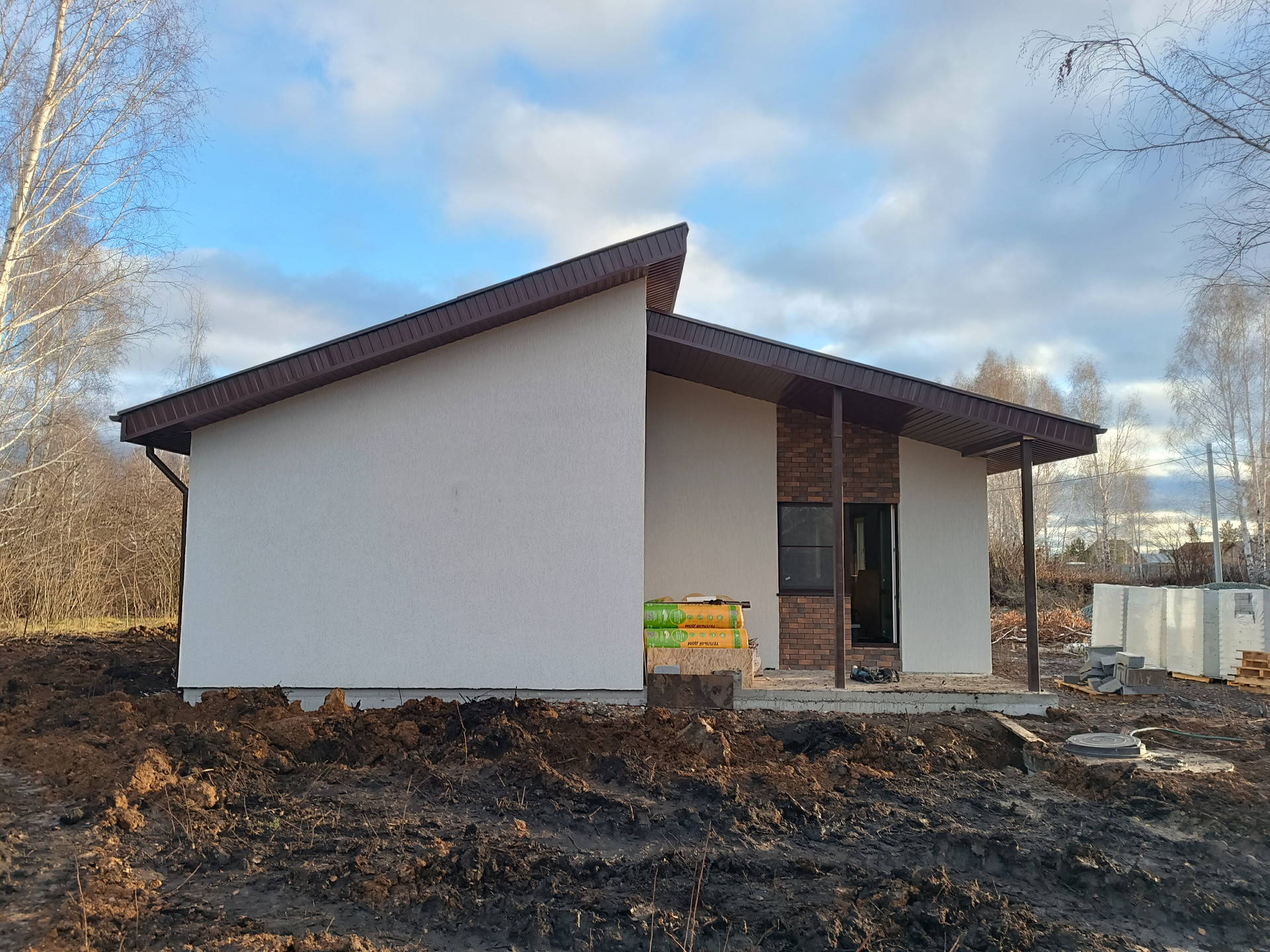 - газоблок 300, фасадный утеплитель 50мм, декоративная штукатурка короед, комбинированный фасад с клинкирным камнем, армопояс по периметру и несущим стенам.