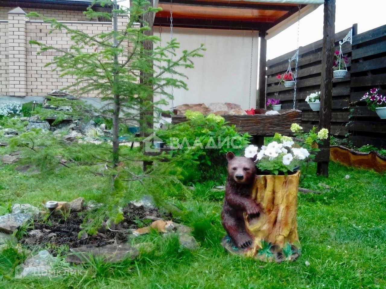 Во дворе релакс зона с подсветкой, сад, пруд, альпийская горка, качели и гриль