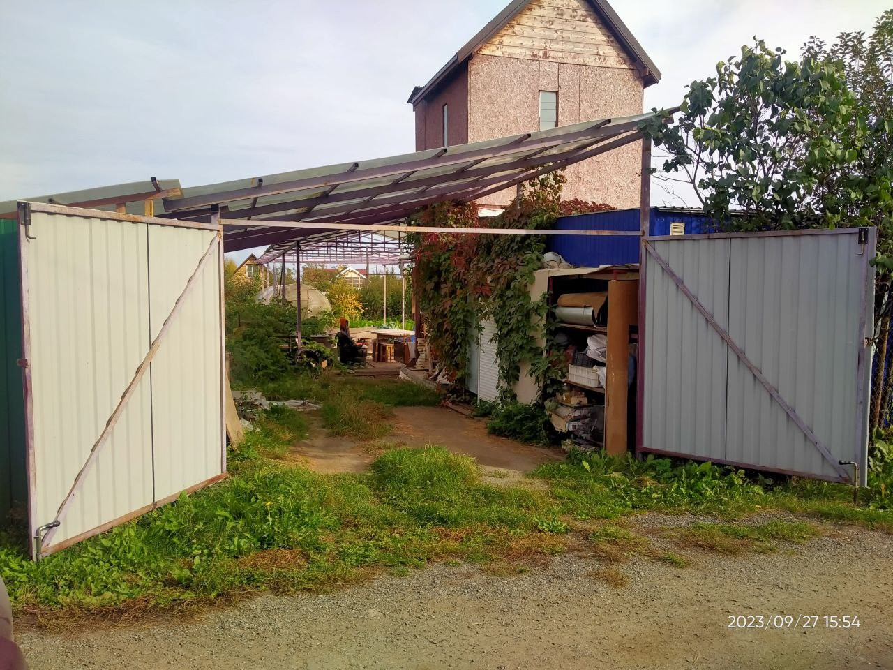 Скважина, 2 теплицы, огромный навес над стоянкой на 2 машины, над мангальной зоной и  несколькими грядками.