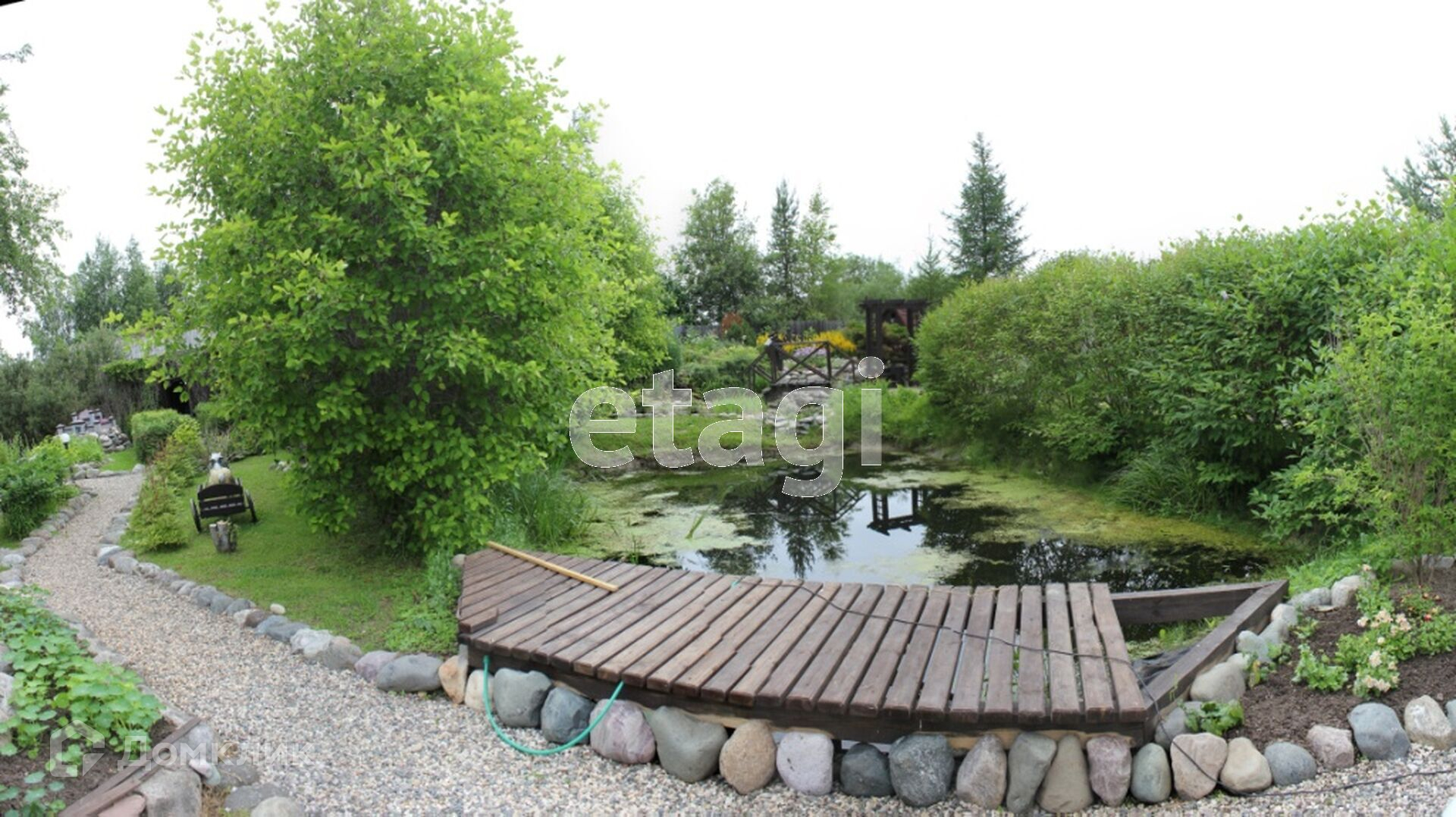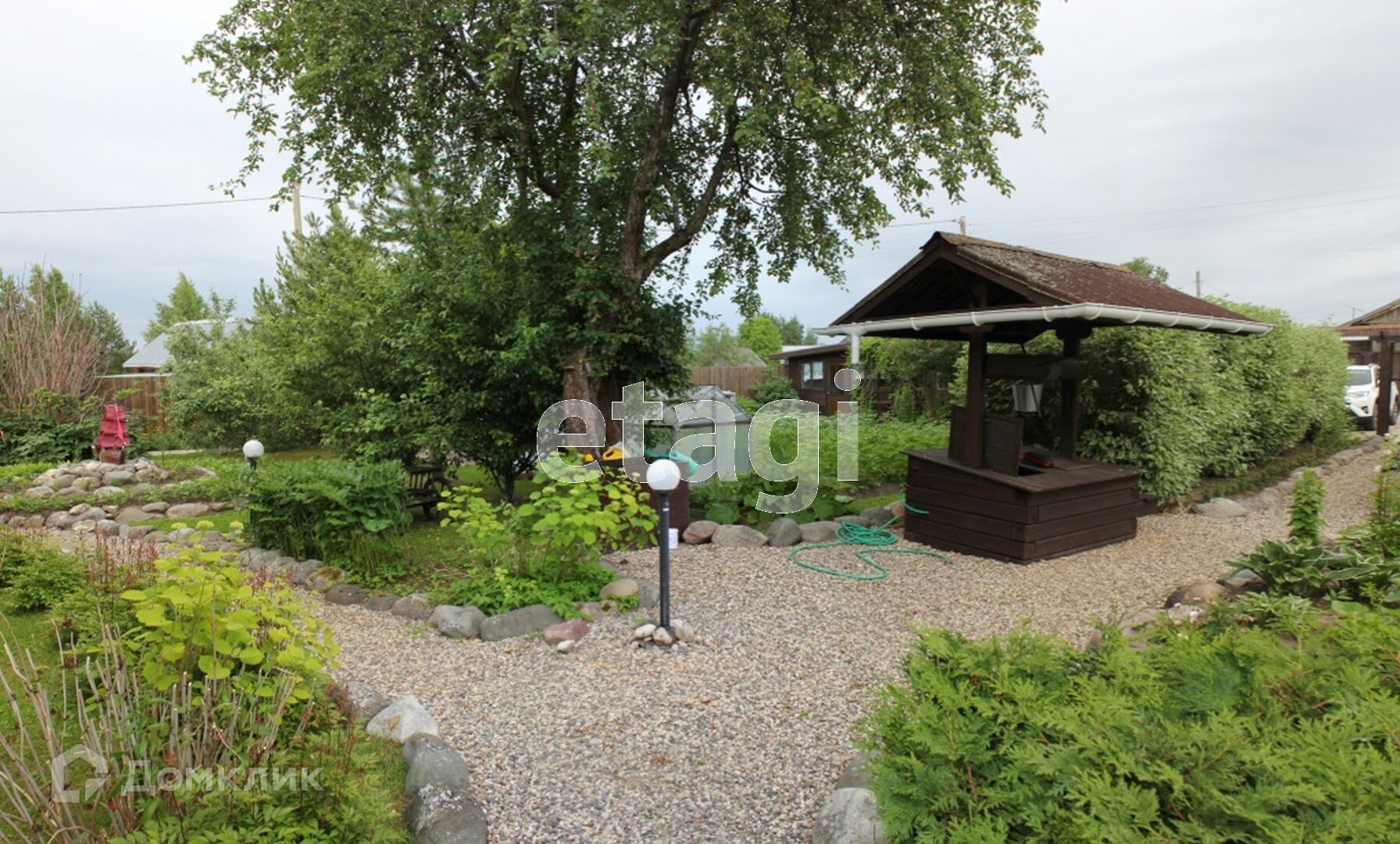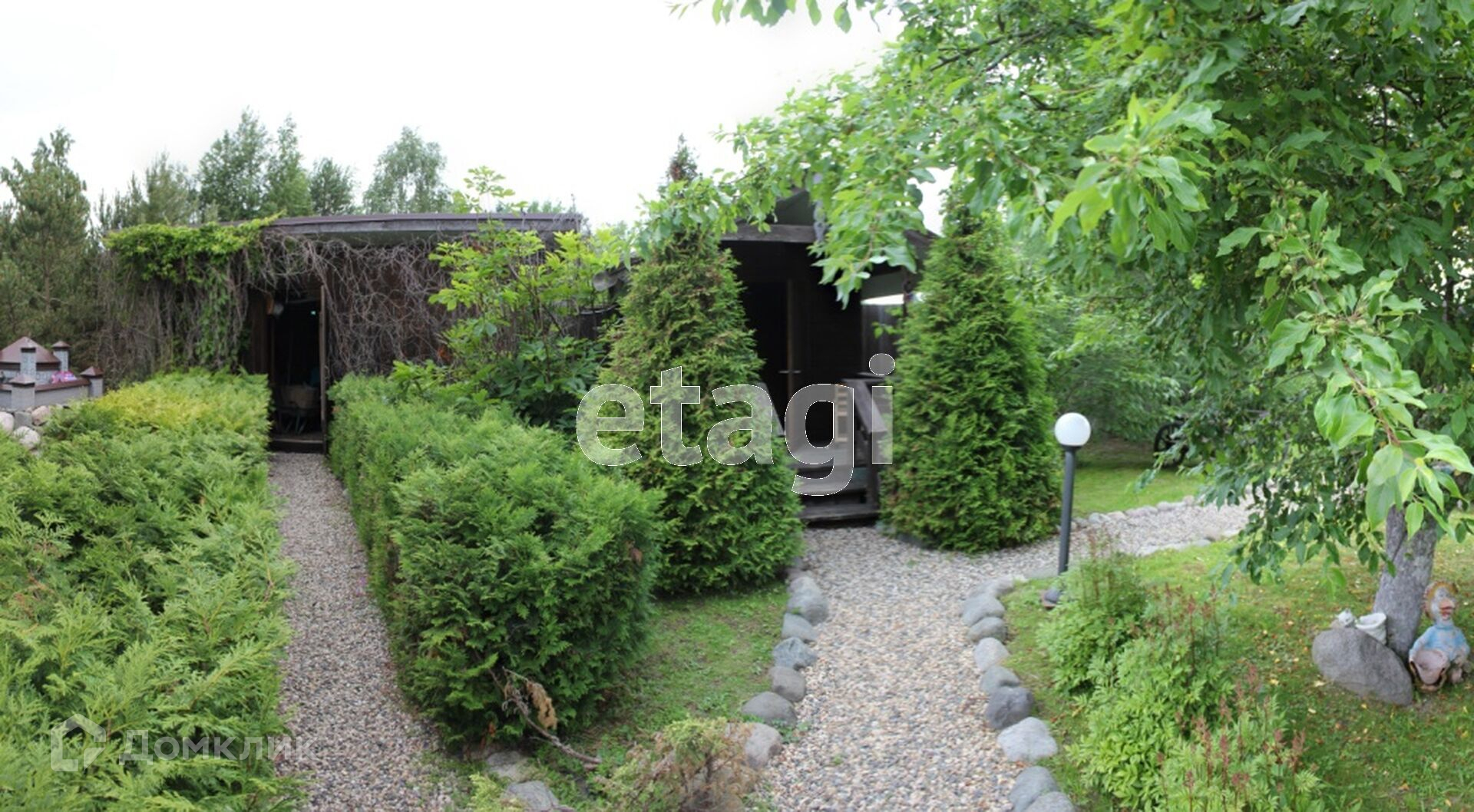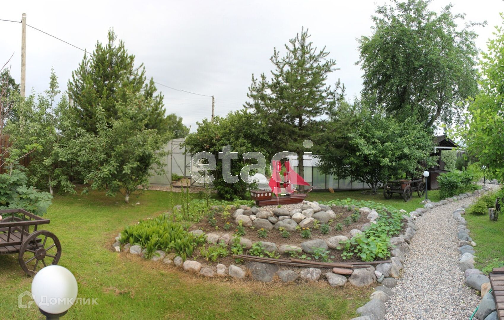На участке выполнен ландшафтный дизайн, посажены дорогостоящие растения, украшен малыми архитектурными формами.
