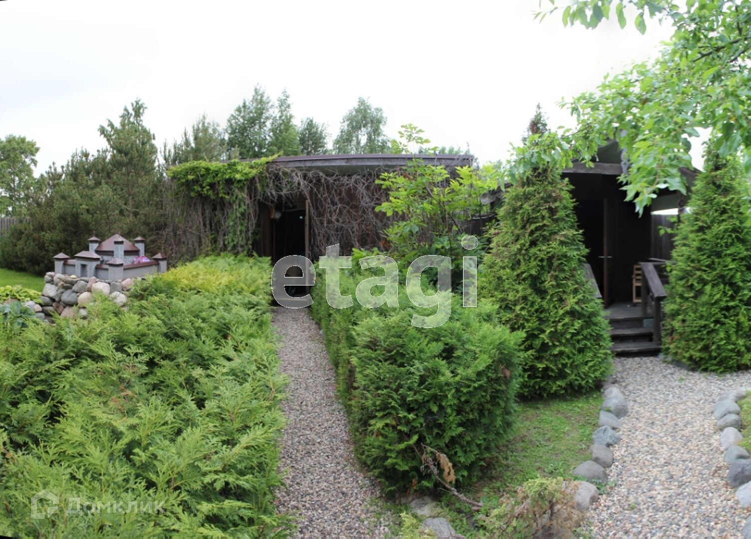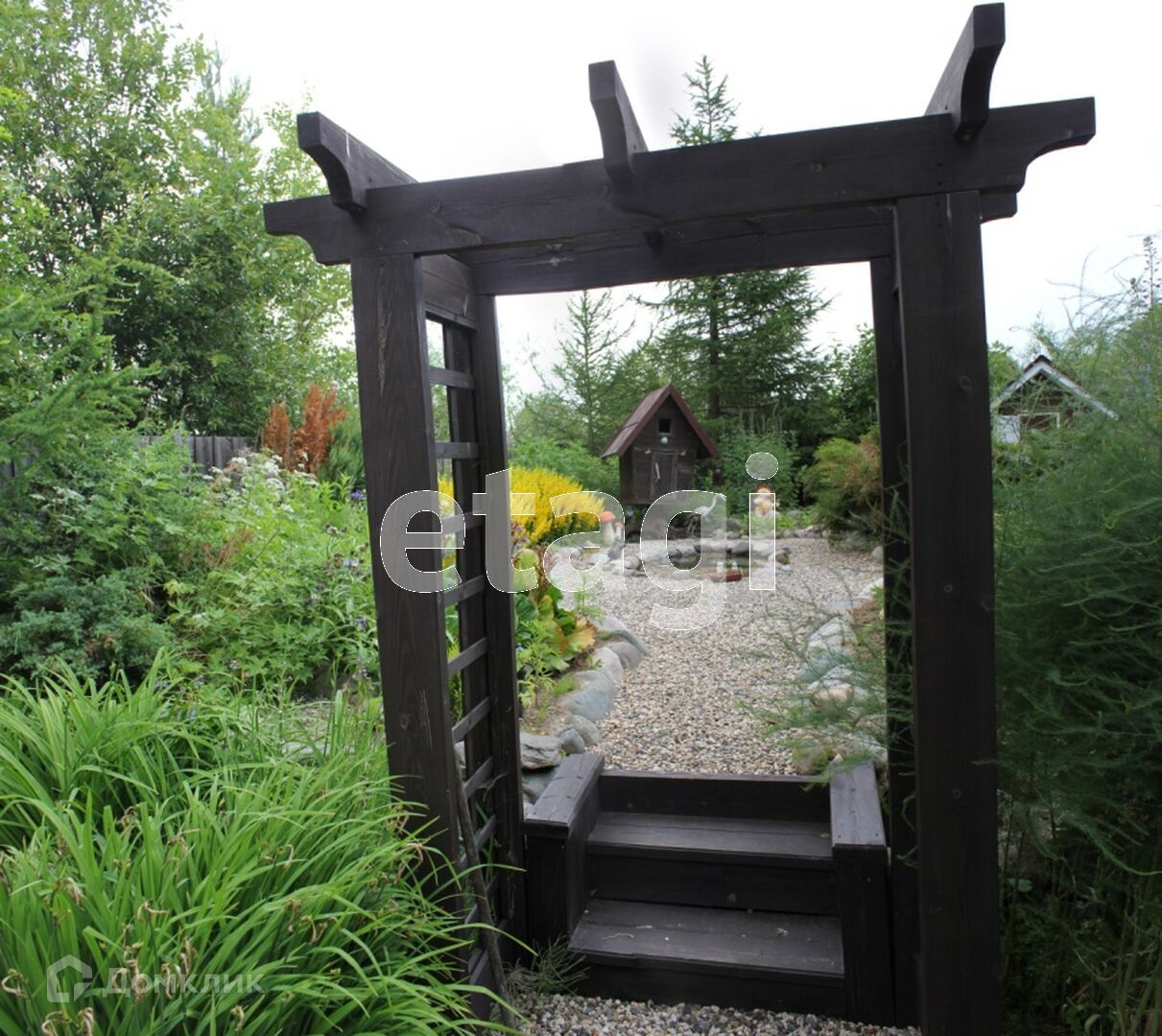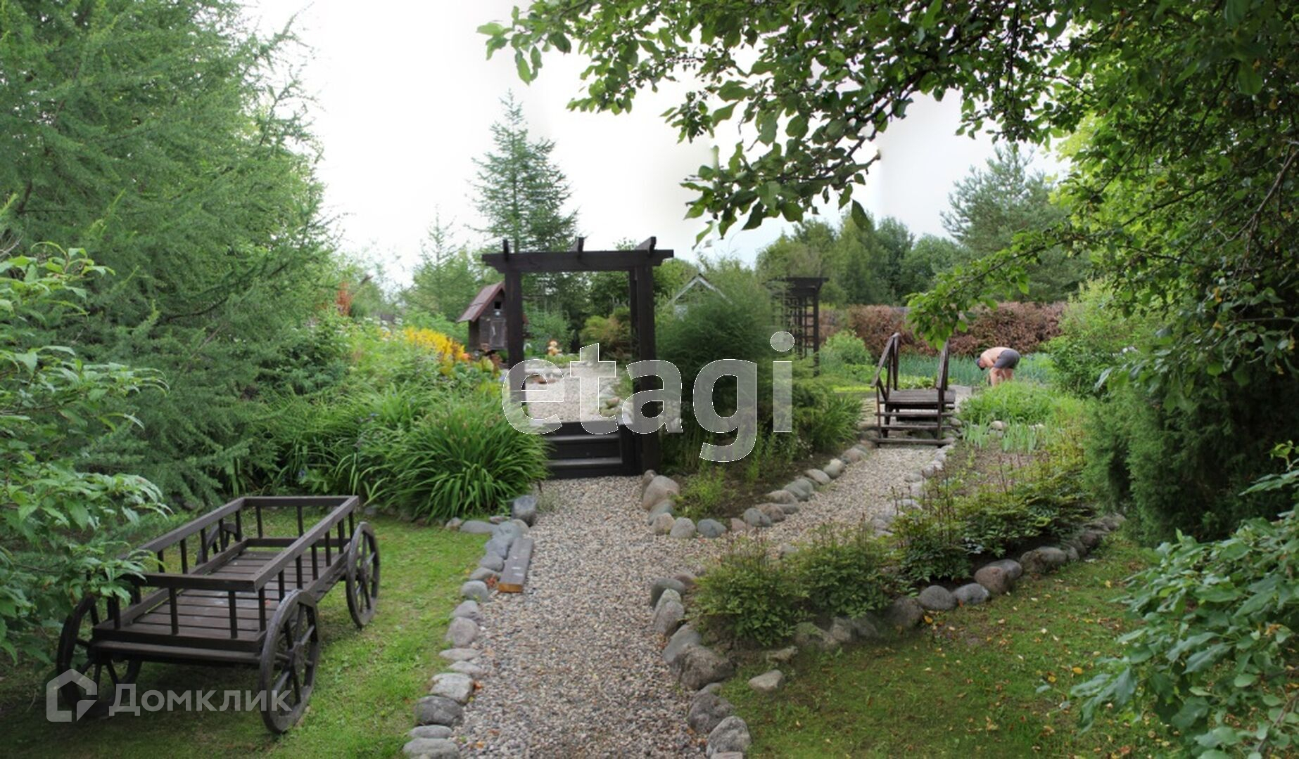 На участке выполнен ландшафтный дизайн, посажены дорогостоящие растения, украшен малыми архитектурными формами.
