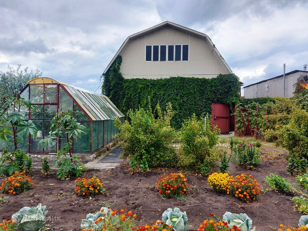 Дом из бруса , облицован кирпичом + Цокольный этаж в полный рост + Баня, гараж со смотровой ямой, мангальная зона , теплицы , кустарники , плодоносящие деревья , огород .