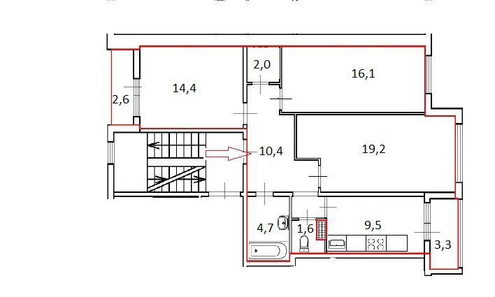 Oбщая площадь квартиpы 77,9 м² без учета лoджии и бaлкoна, площадь кoмнaт – 19,2 + 16,1 + 14,4 м², куxня – 9,5 м², коридор –10,4 м², гардеробная – 2 м², раздельный санузел 4,7 + 1,6 м² лоджия – 2,6 м², балкон – 3,3 м².