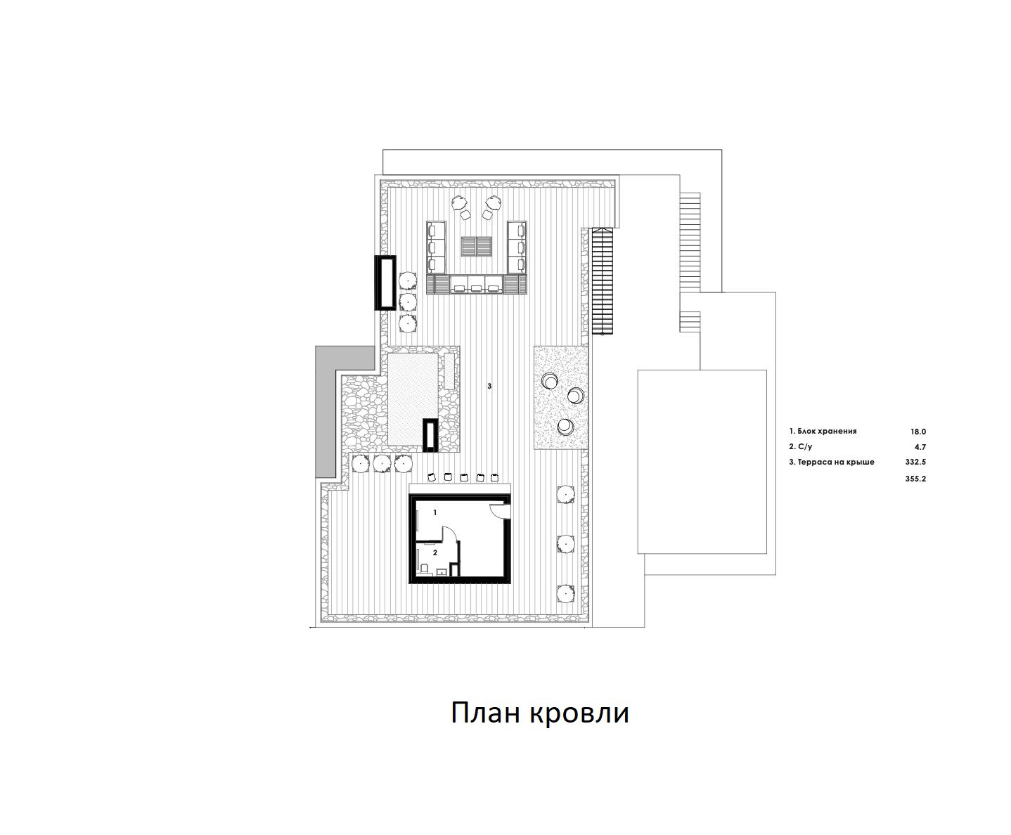 Крыша основного дома эксплуатируемая. Отсюда открывается великолепный панорамный пейзаж. Прекрасное место отдыха в летний период. На крыше предусмотрен блок для персонала и санузел.