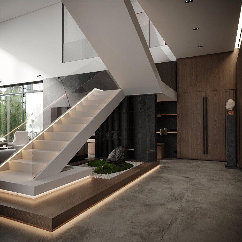 Первый этаж основного дома является общественной зоной, здесь спроектированы гостиная, кухня, столовая, кабинет, гардеробная, санузел и зона спа, которая имеет прямой выход во внутренний двор с террасой, открытой столовой, зоной отдыха и садом. На первом этаже гостевого дома с отдельным входом предусмотрены парковочные места на 2 машины, котельная, пространство для хранения, постирочная.
