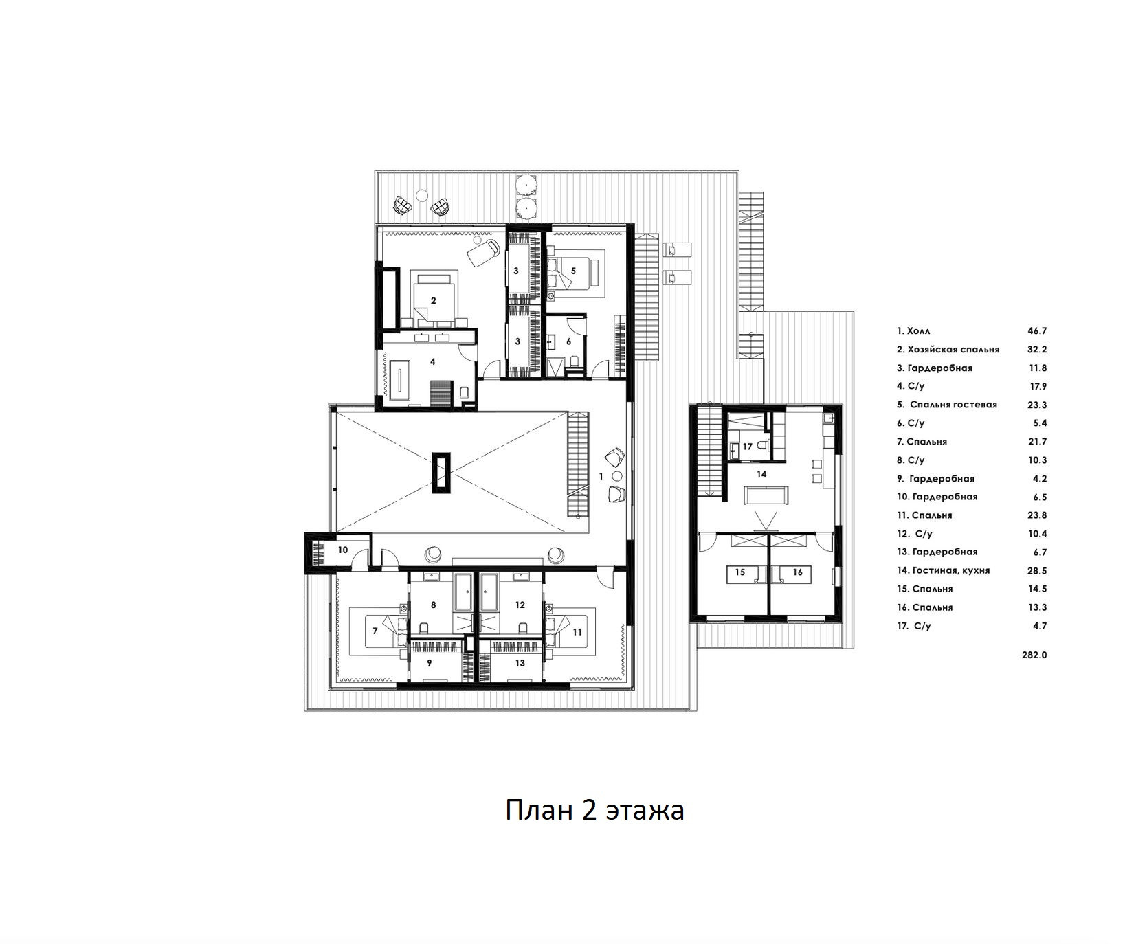 На втором уровне располагается частная зона, там спроектированы комнаты для семейного пользования - спальни, каждая из которых имеет свой санузел, гардеробную комнату и выход на балкон. В гостевом доме на втором этаже находится жилая зона: 2 спальни, кухня-гостиная и санузел. Также предусмотрен отдельный вход.