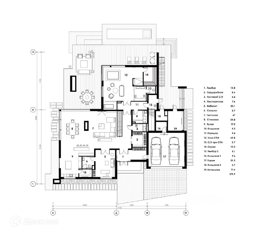 Первый этаж: прихожая, холл, гардеробная, гостевой с/у, гостиная с камином и вторым светом, зона столовой, кухня, кабинет/спальня с с/у, СПА-зона с сауной и выходом, на террасу-патио, постирочная, гараж на 2 м/м, кладовая, котельная.