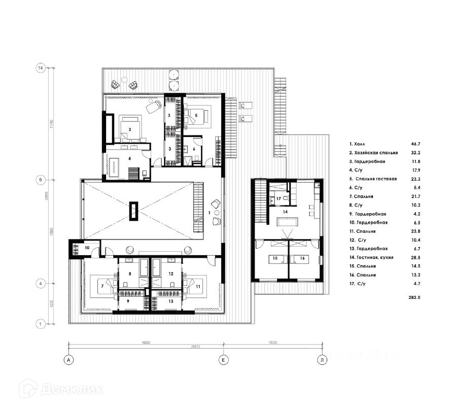 Второй этаж: три спальни со своими с/у и гардеробными, спальня с с/у, гостевой блок с 2-мя