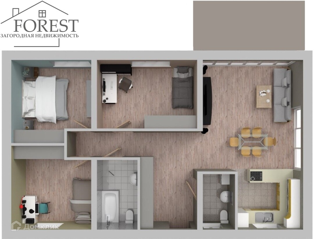 Дом с продуманной и современной планировкой: три комнаты и совмещенная кухня-гостиная, отдельная котельная и санузел.