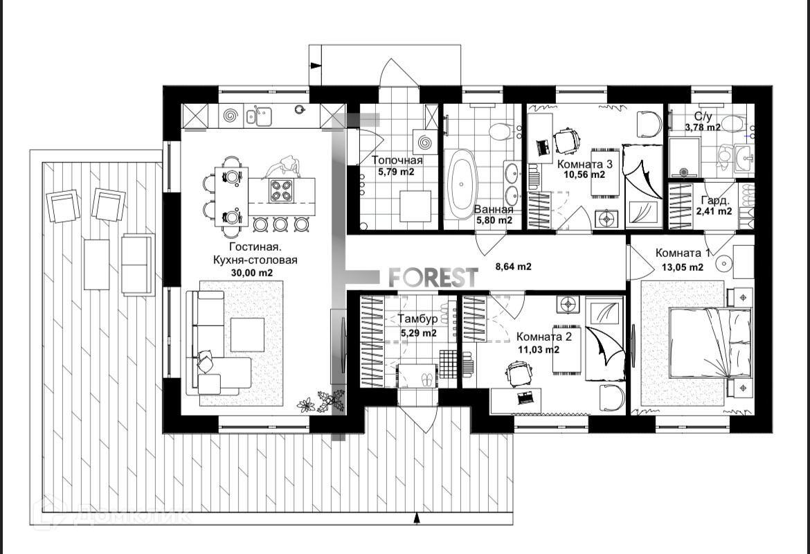 Спальня 12,6 м2Спальня 10,08 м2Спальня 13,69 м2Кухня/гостиная 31,87 м2С/у гостевой 2,7 м2С/у основной 8,45Котельная 5,76 м2Терраса 27,13 м2