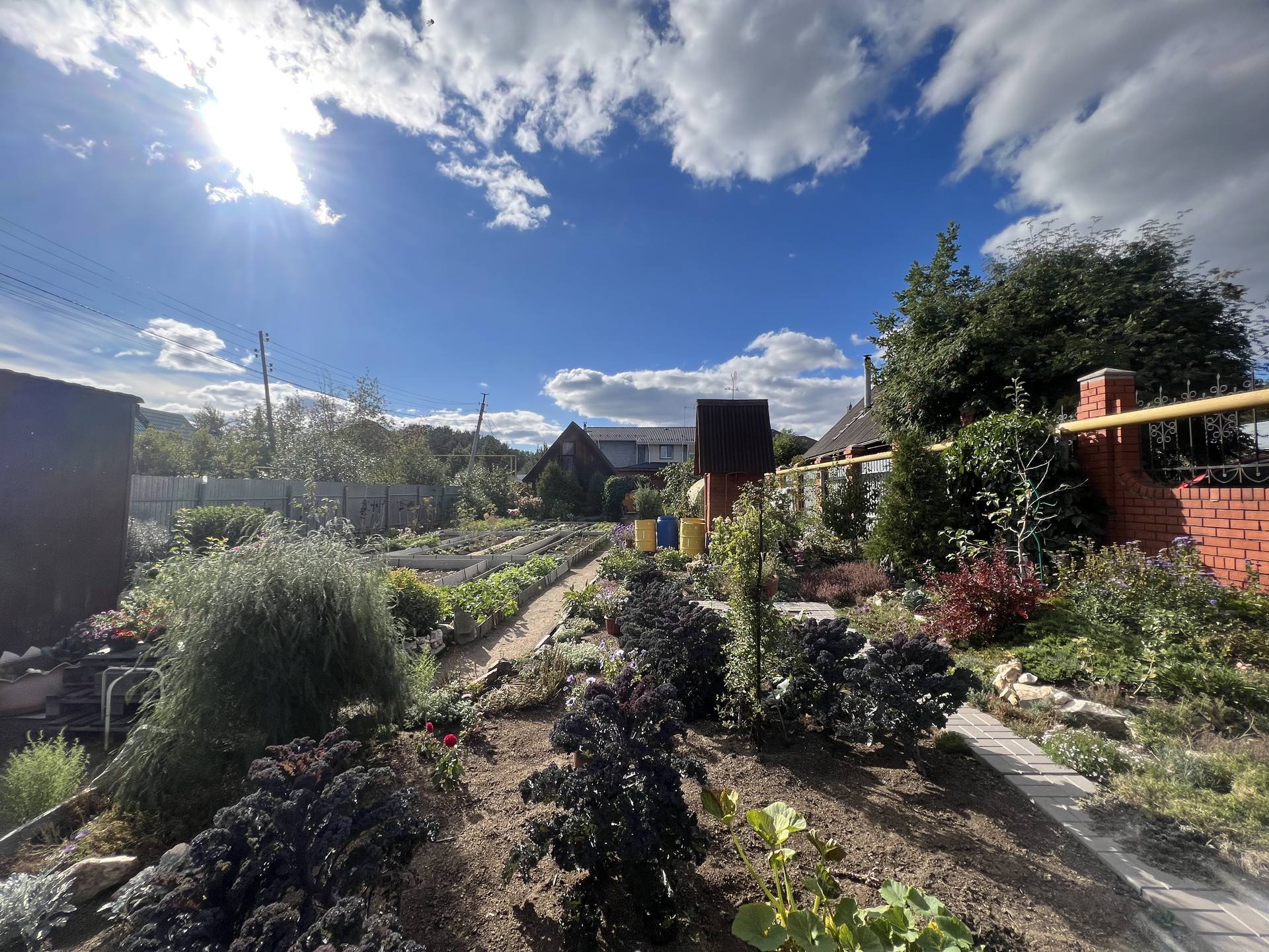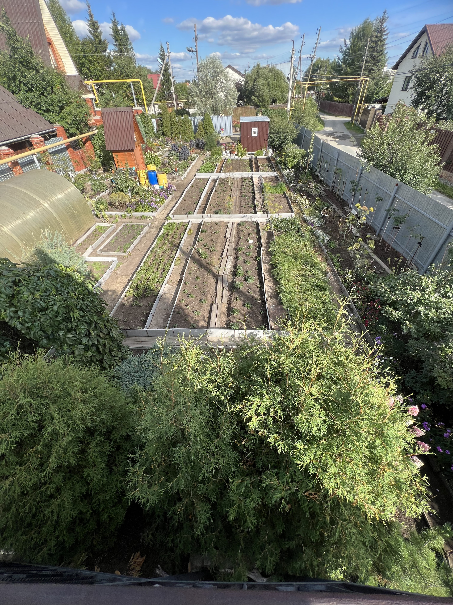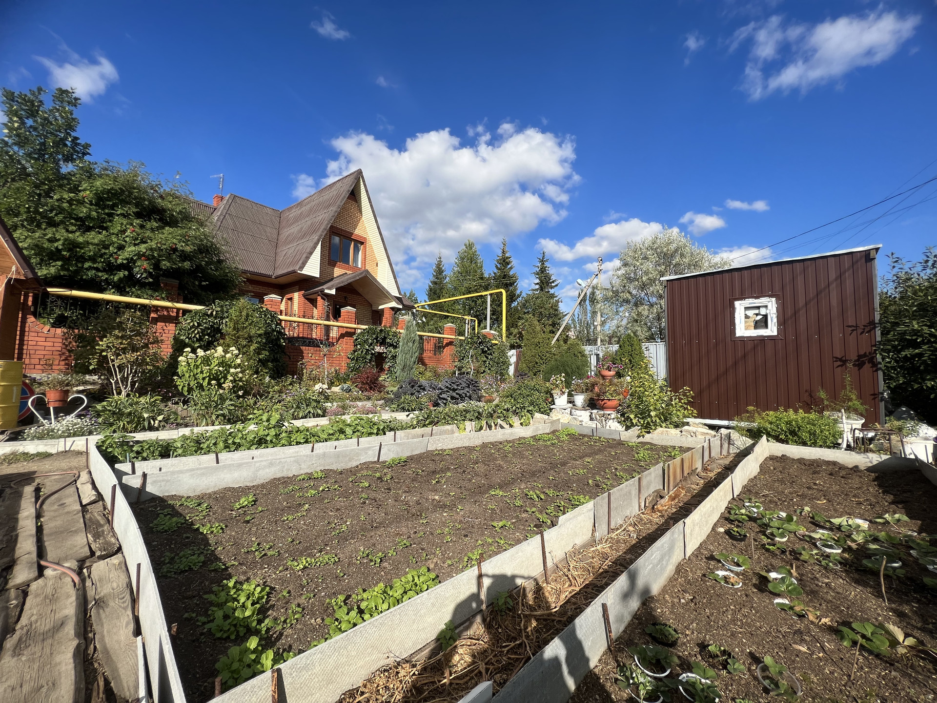 Выращены плодовые деревья (абрикосы, яблони, груши, сливы, вишни, ирга), кустарники (малина, крыжовник, смородина, декоративные кустарники, барбарис, сирень, туи, можжевельники).