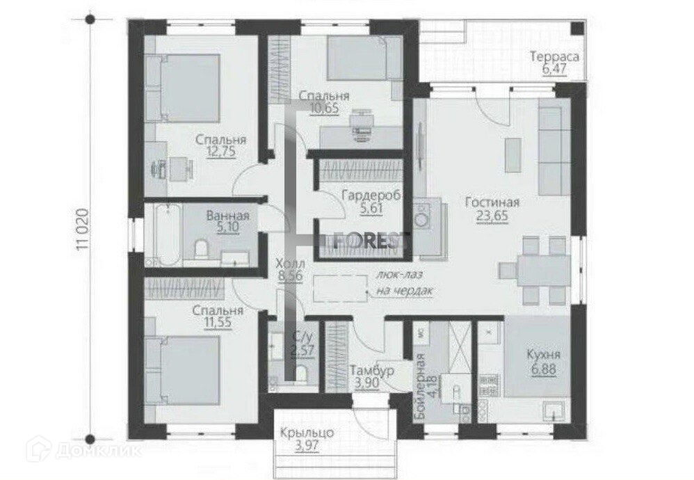 Тамбур 4,9м2Котельная 3,8м2Коридор 7.8м2С/у 2.8м2 и 5.1м2Спальня 12.4м2Спальня 12,7м2Спальня 12,5м2Гардероб 4.1 м2Гостиная с выходом на террасу,37м2Терраса