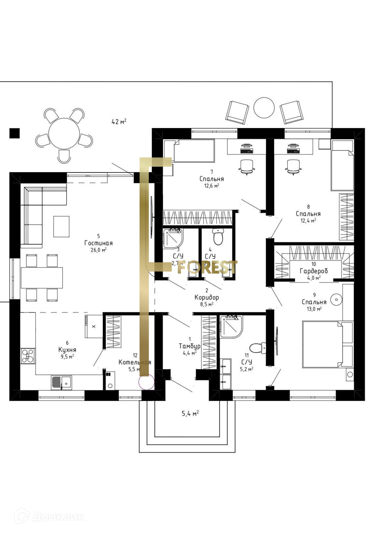 Дом из качественных материалов, с планировкой: три жилые комнаты , кухня-гостиная 36 кв.м. , 2 санузла, терраса 42 кв.м..
