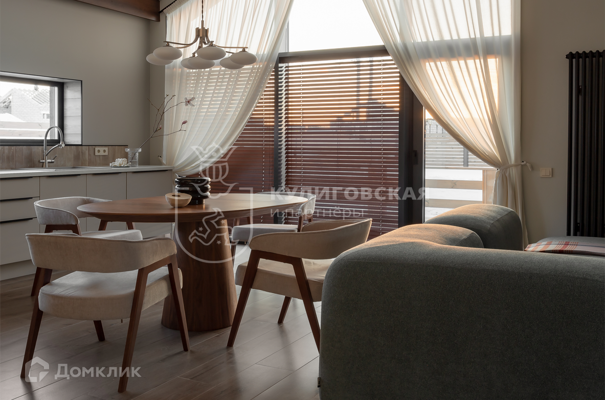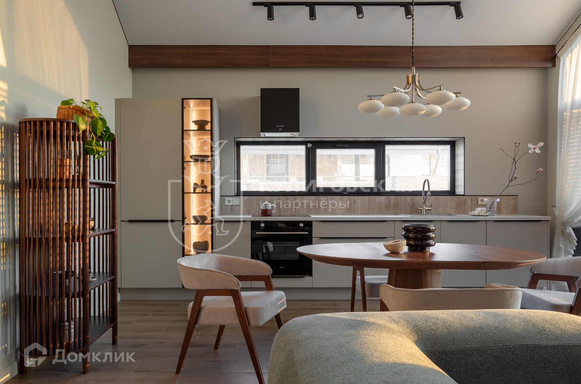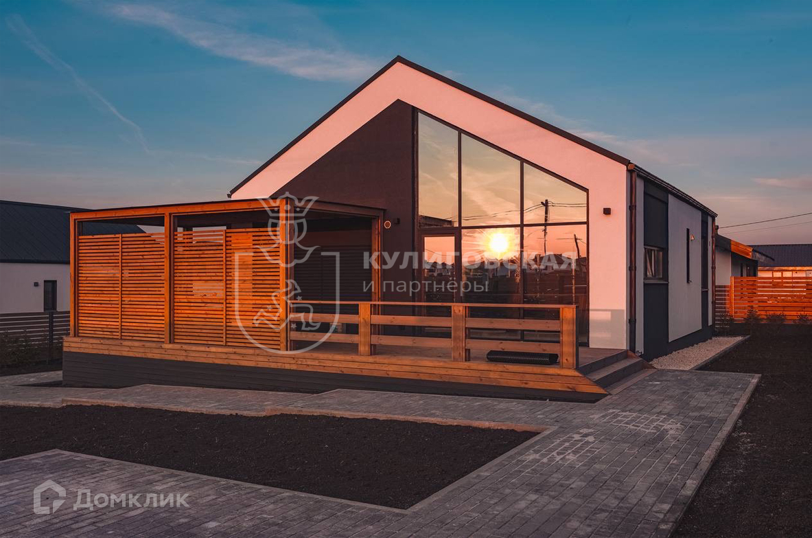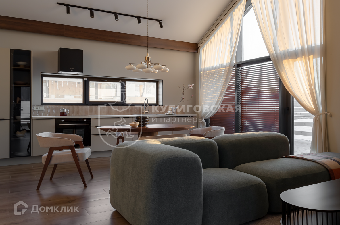 Дом полностью укомплектован и готов для комфортного круглогодичного проживания. Дизайнерский ремонт выполнен из качественных материалов, мебель сделана на заказ. В доме просторная кухня-гостиная, мастер-спальня с гардеробной и санузлом, гостевая комната с рабочей зоной и открытая терраса площадью 40 кв. м.