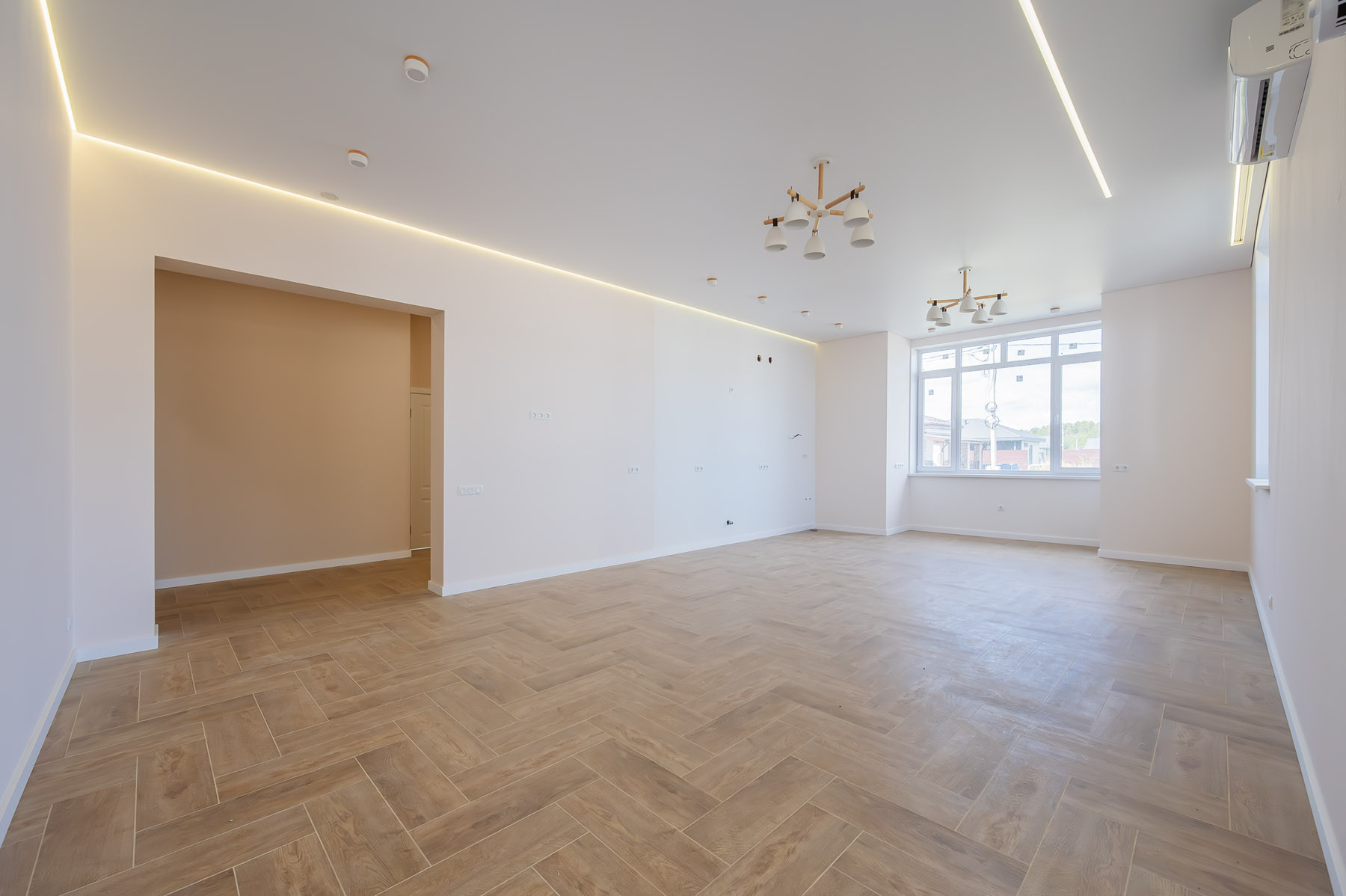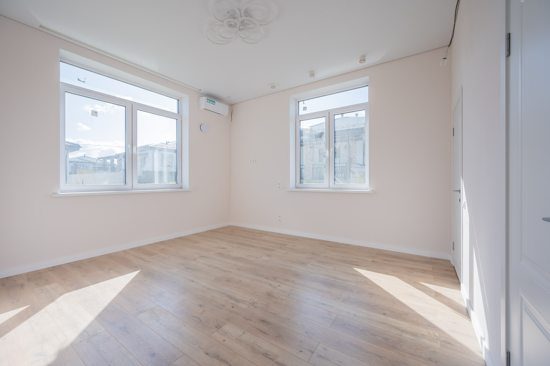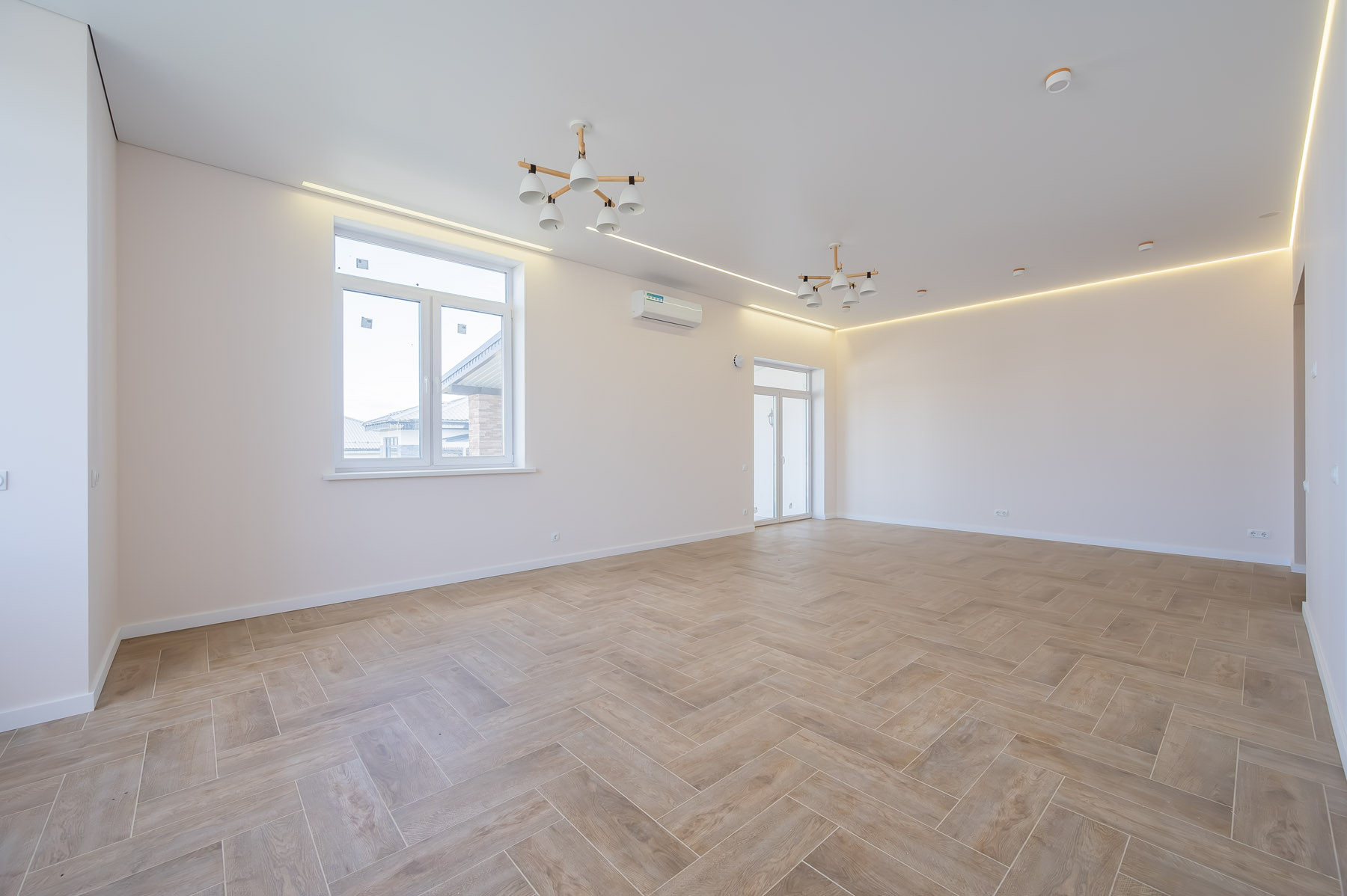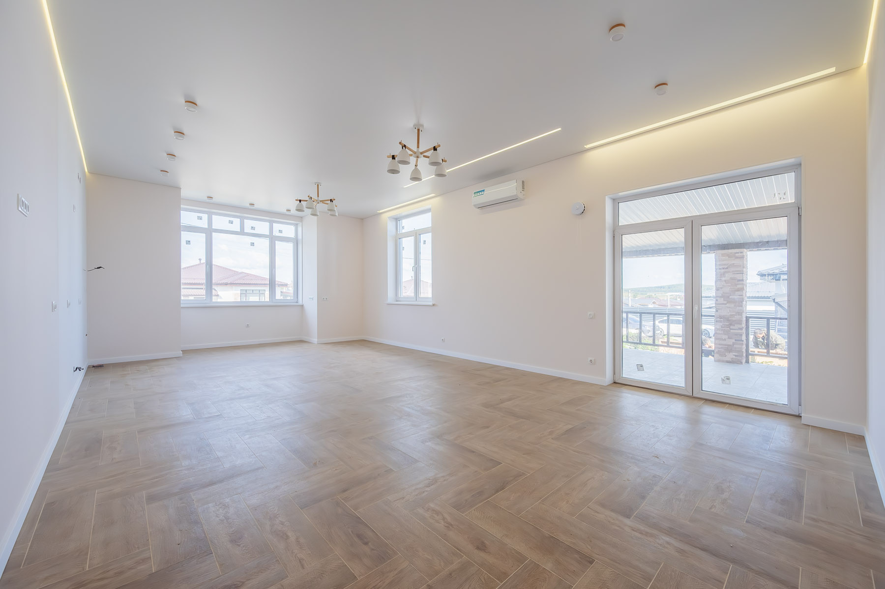 В доме использованы качественные материалы: широкоформатный керамогранит, натяжные потолки с теневым профилем и подсветкой, во всем доме установлено освещение. Стены оклеены стеклохолстом и окрашены, ванные комнаты оборудованы сантехническими приборами. В спальне и гостиной установлены кондиционеры.