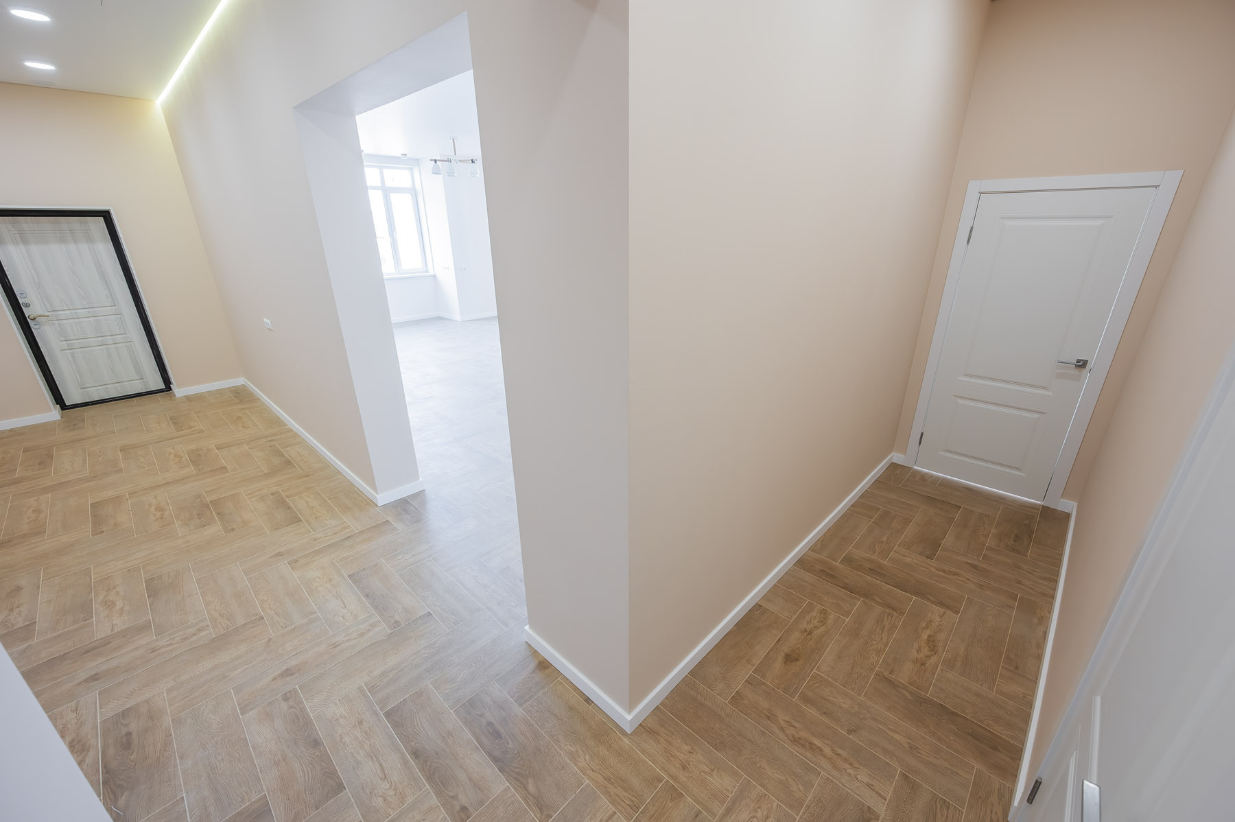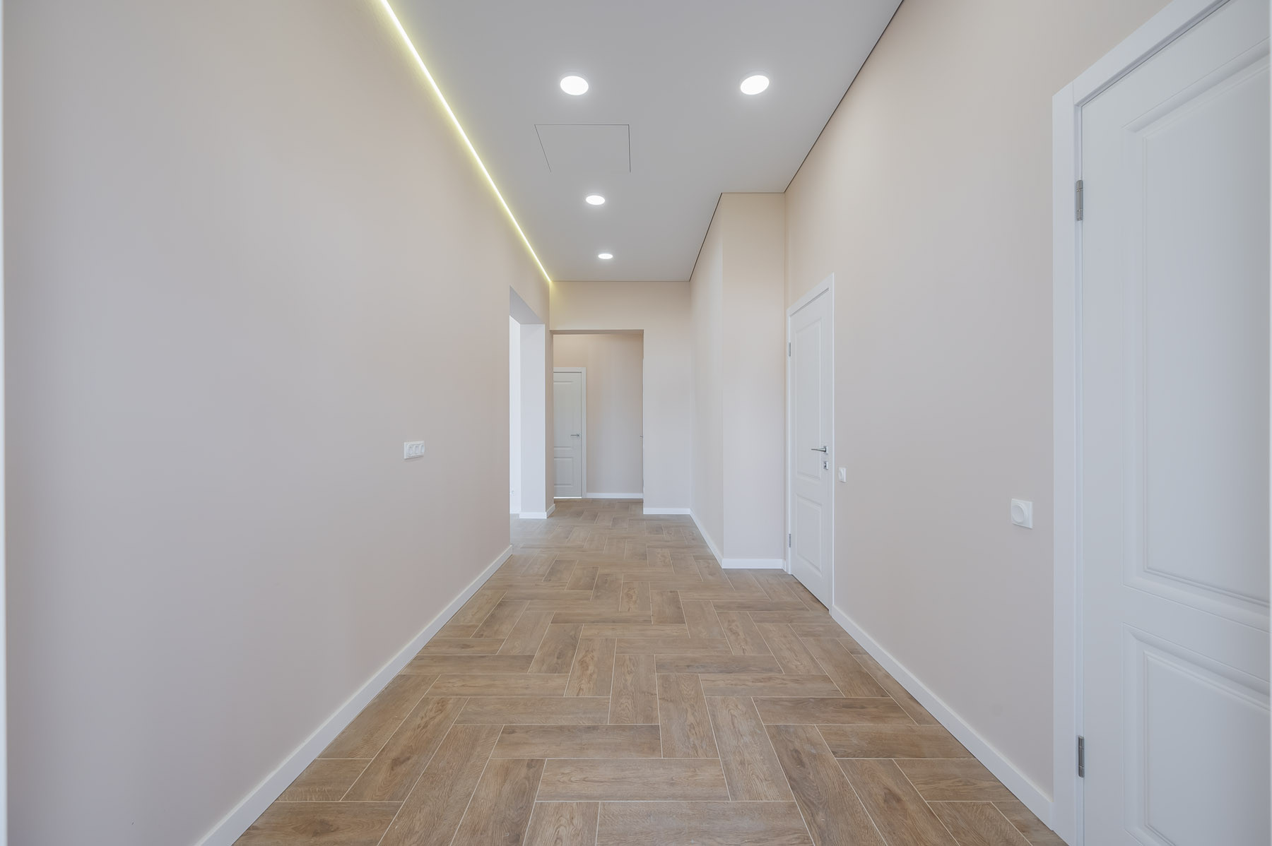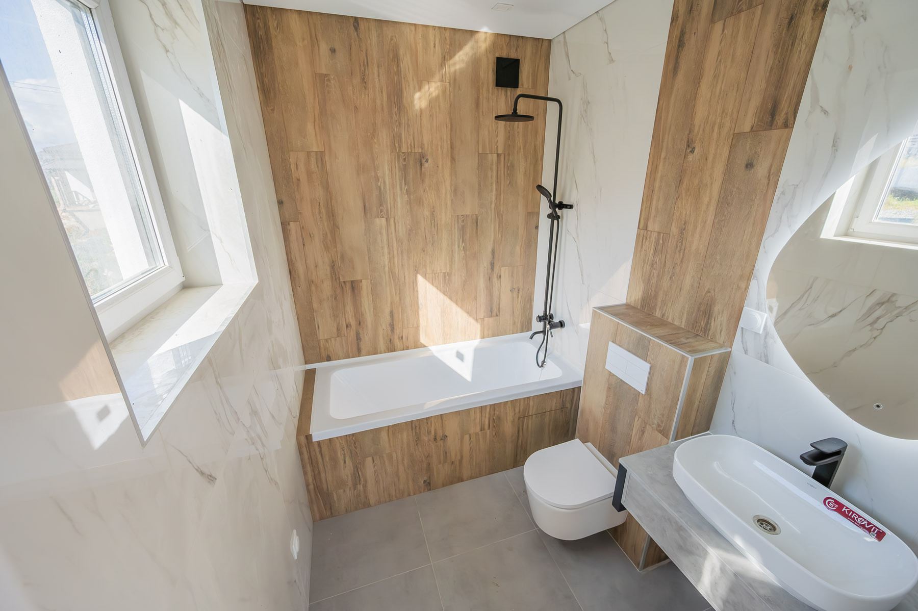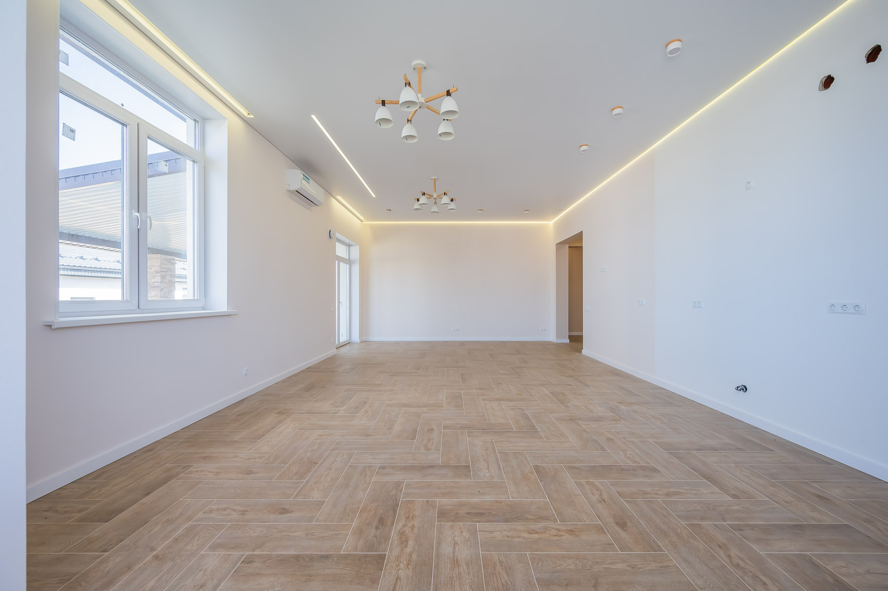 В доме использованы качественные материалы: широкоформатный керамогранит, натяжные потолки с теневым профилем и подсветкой, во всем доме установлено освещение. Стены оклеены стеклохолстом и окрашены, ванные комнаты оборудованы сантехническими приборами. В спальне и гостиной установлены кондиционеры.