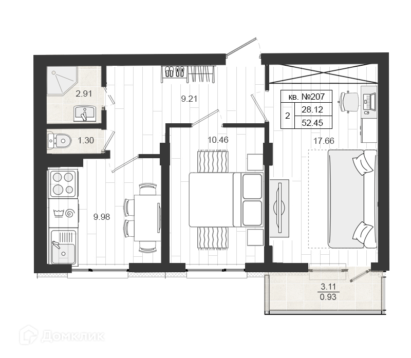 Общая площадь 52.45 м2