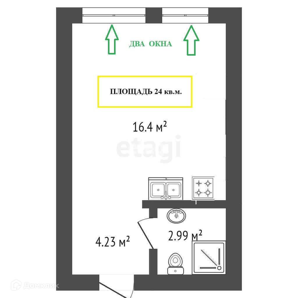 Самая выгодная цена! Широкая студия с двумя окнами площадью 24 кв.м. Удобно будет сделать зонирование кухонной зоны и зоны отдыха. Черновая отделка позволит сделать ремонт по своему вкусу. Окна квартиры выходят на восток. Малоэтажный дом в ЖК Верево Сити- все дома высотой 4 этажа.