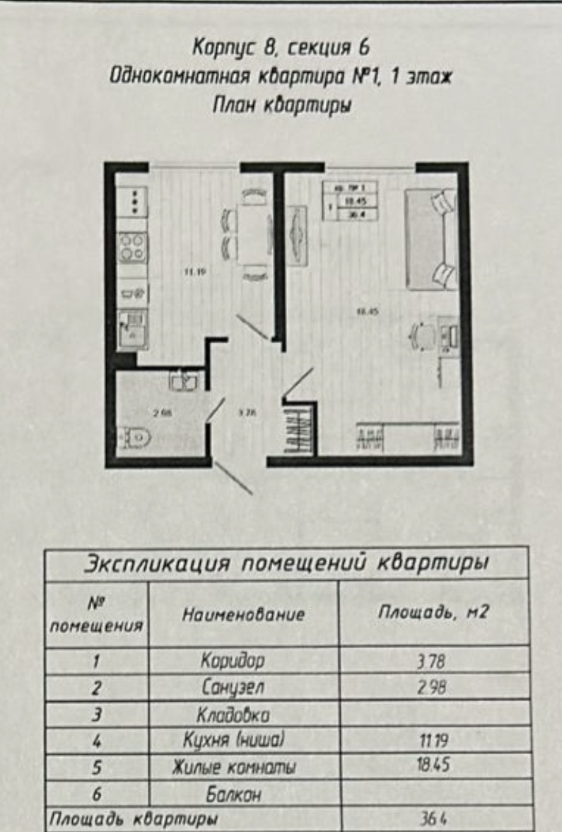 Общая площадь 36.4 м2