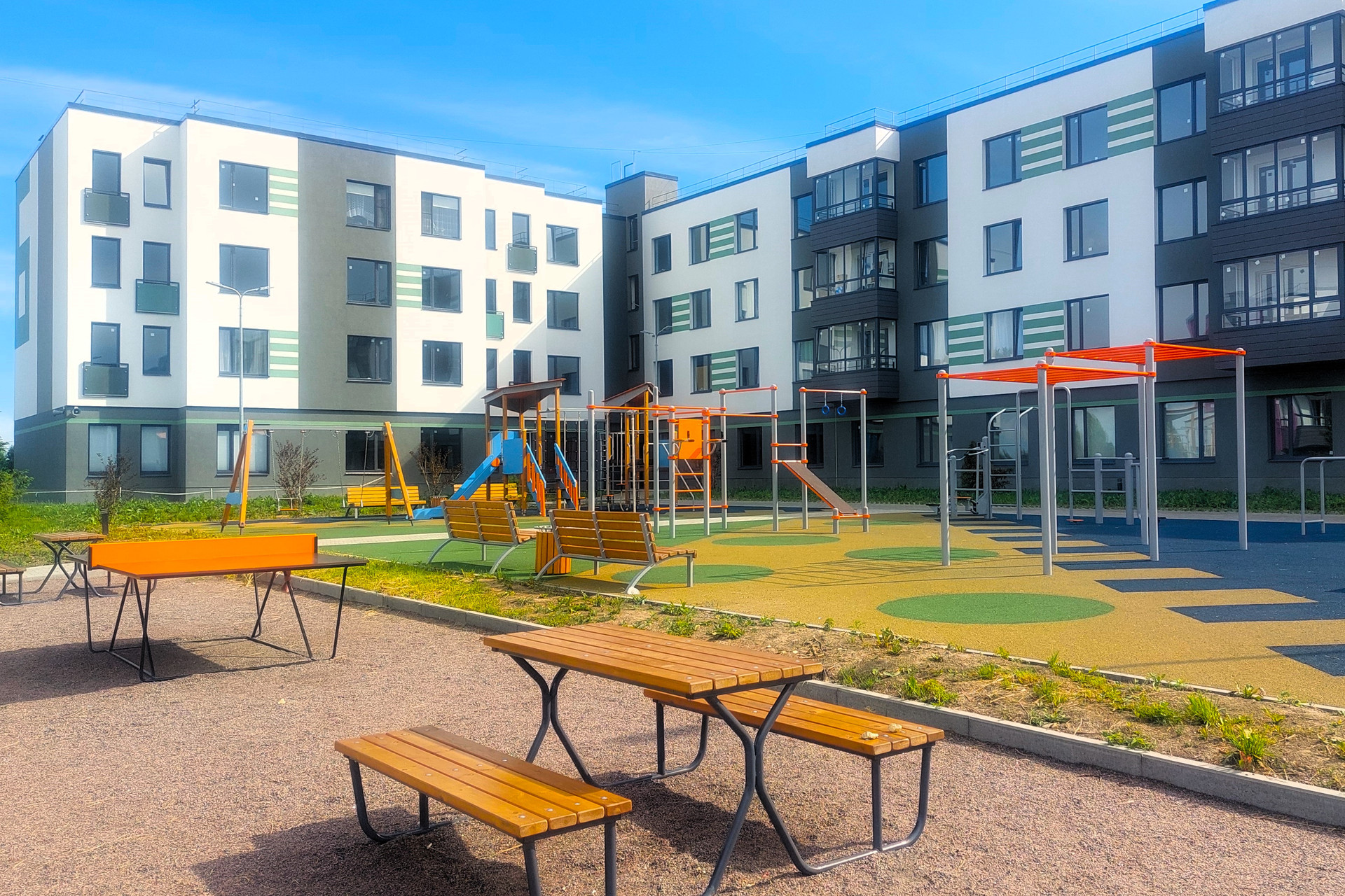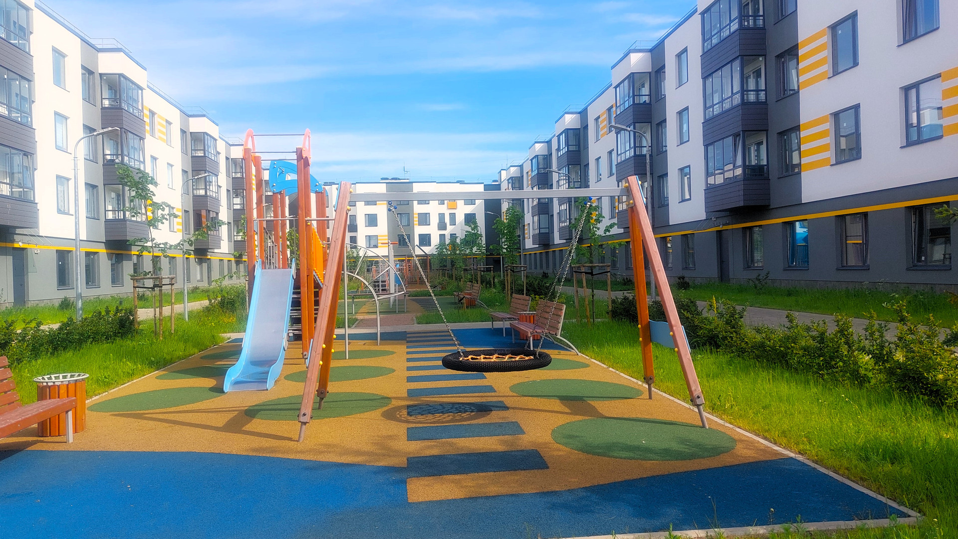 В комплексе расположены детские и спортивные площадки, между домами большое открытое пространство. Здесь приятно жить, чувствуется много воздуха.