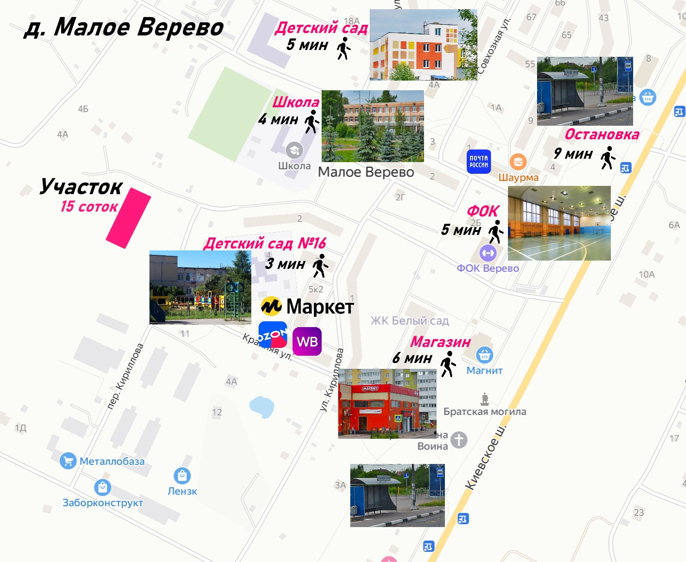 Участок отмежеван. Вся инфраструктура в шаговой доступности: детский садик, школа, амбулатория, отделение почты, пункты выдачи интернет заказов, сетевые и продуктовые магазины. Отличное место для строительства дома и круглогодичного пмж.