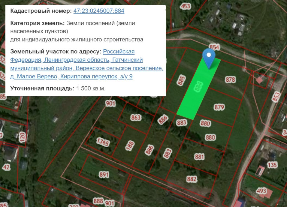 Кадастровый номер: 47:23:0245007:884. Категория: Земли населенных пунктов, использование: для индивидуального жилищного строительства.
