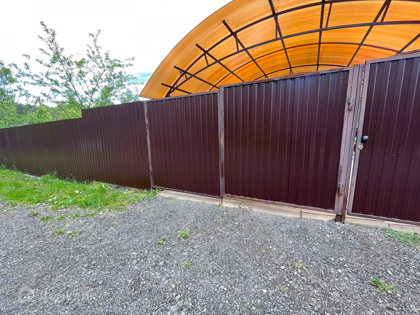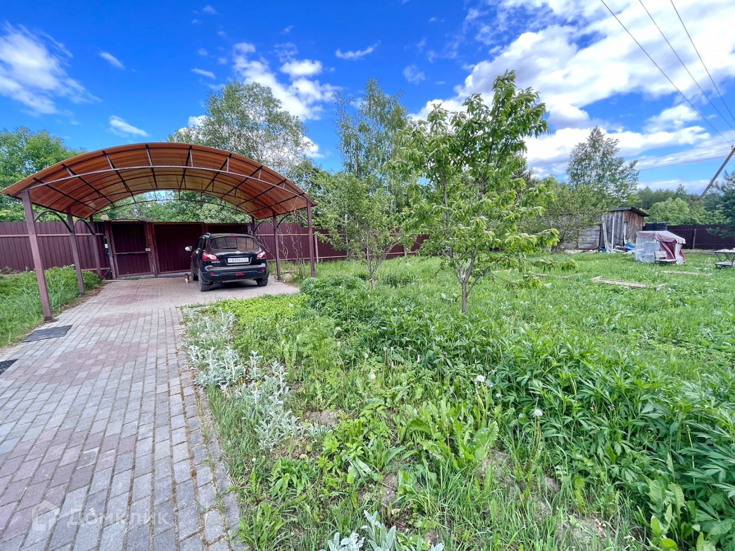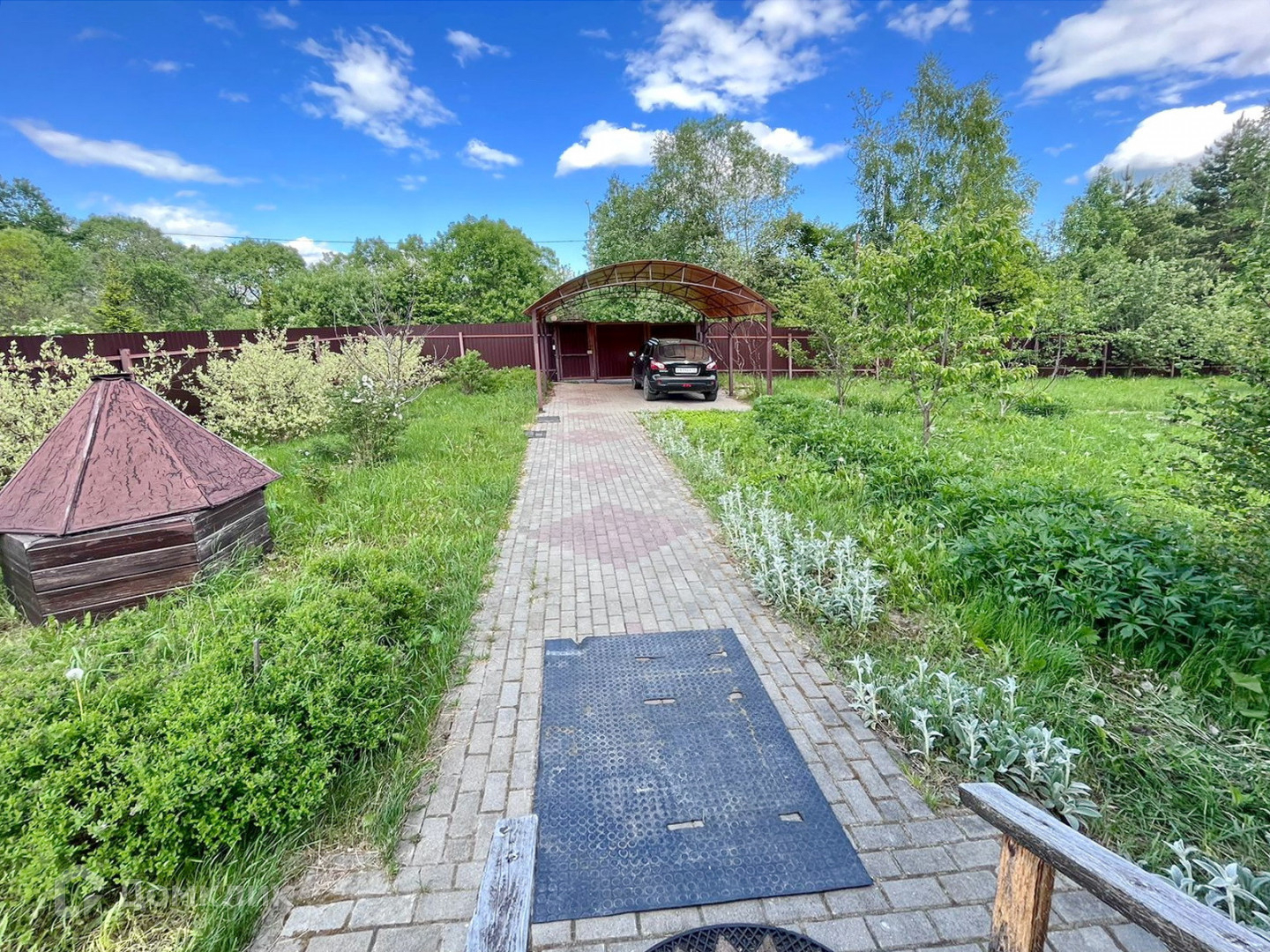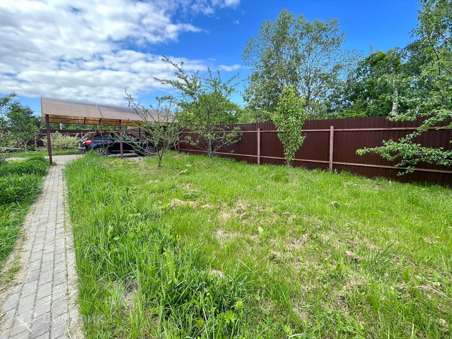 * Участок огорожен забором из профлиста со всех сторон, есть навес для автомобиля. Выложены дорожки. По всему участку газон.