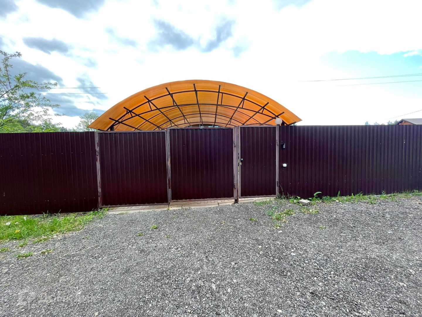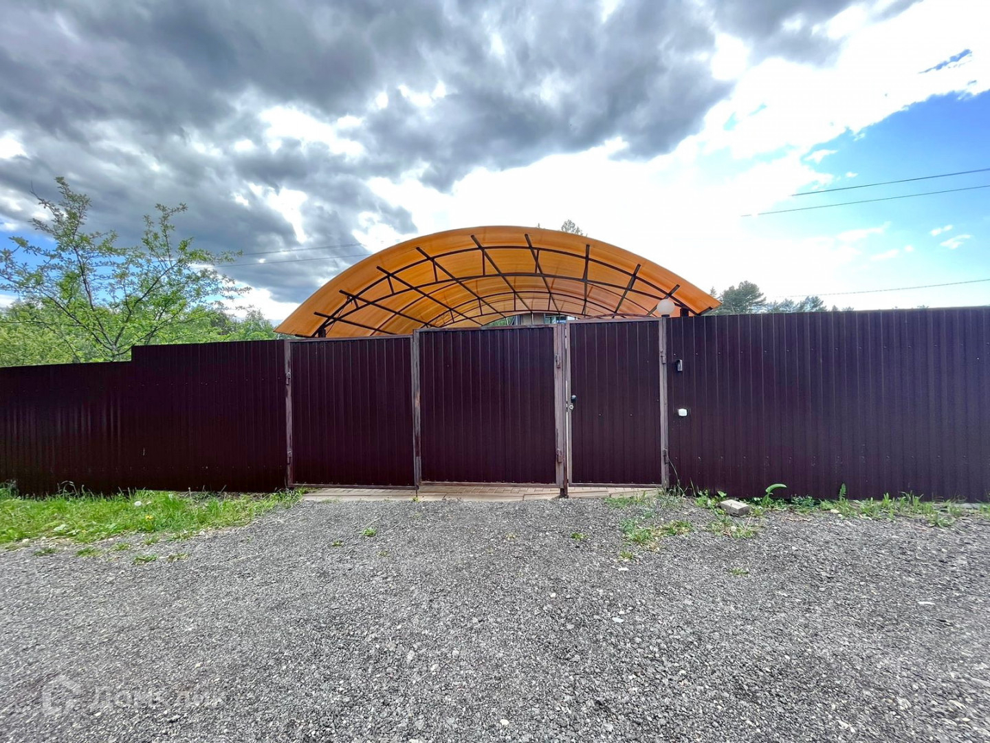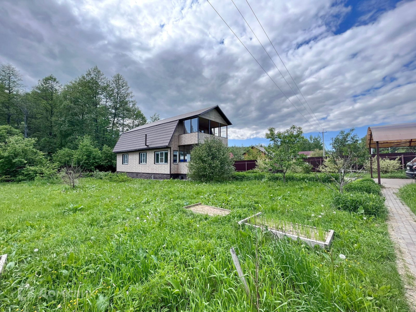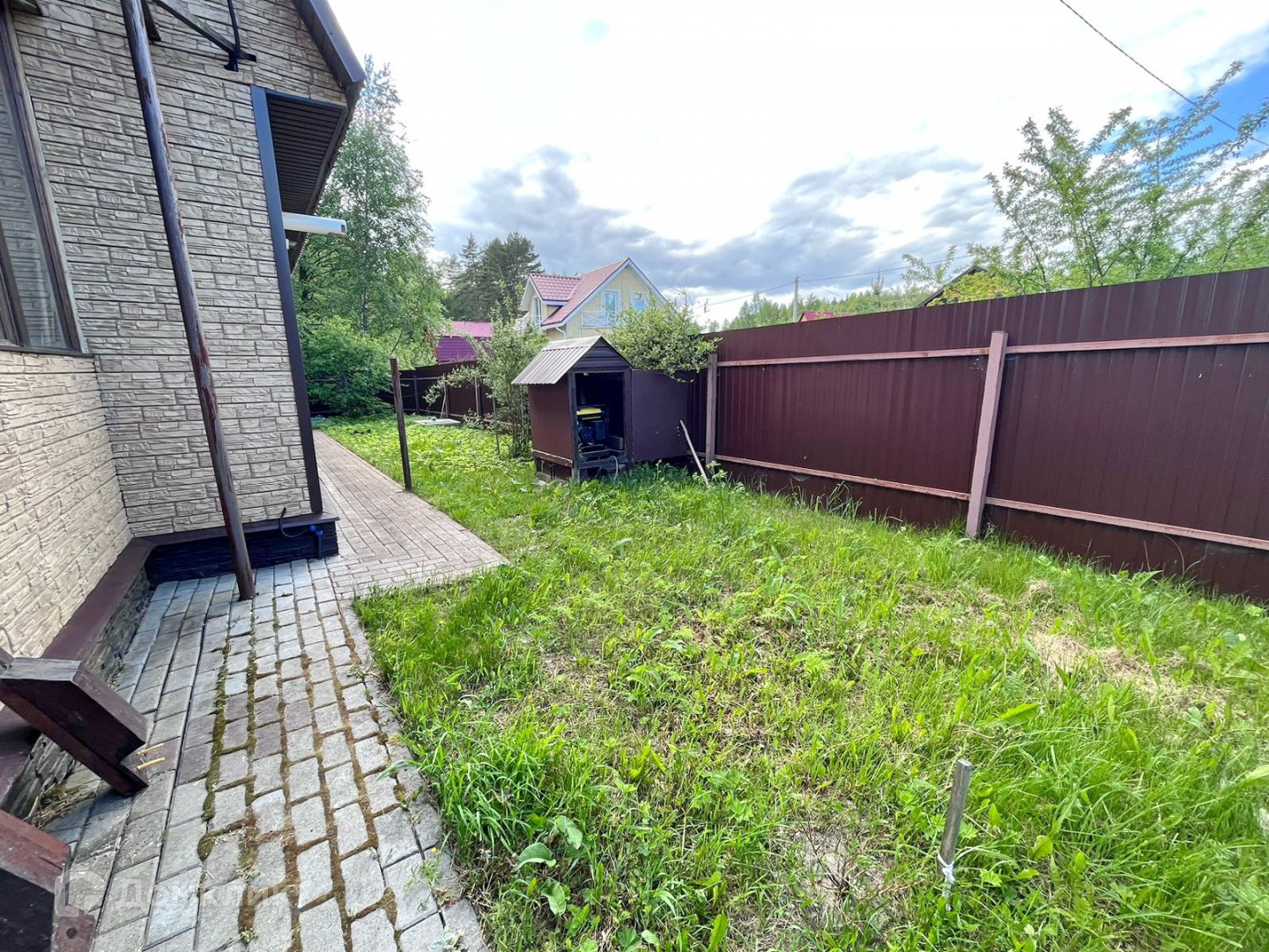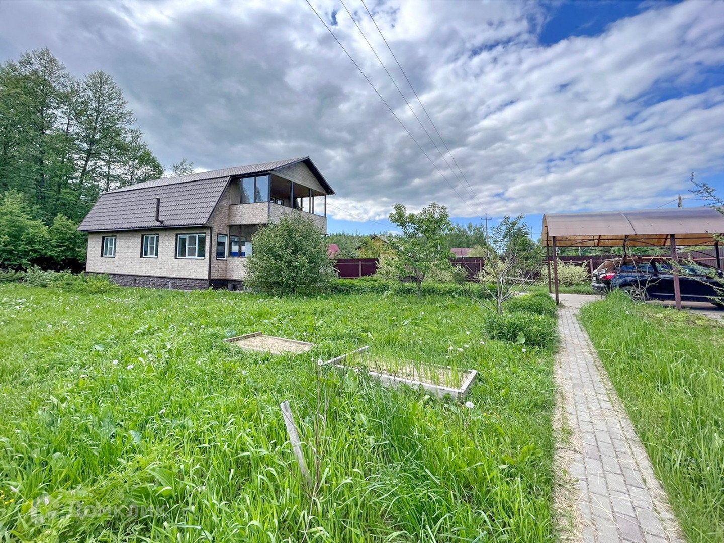 * Участок огорожен забором из профлиста со всех сторон, есть навес для автомобиля. Выложены дорожки. По всему участку газон.
