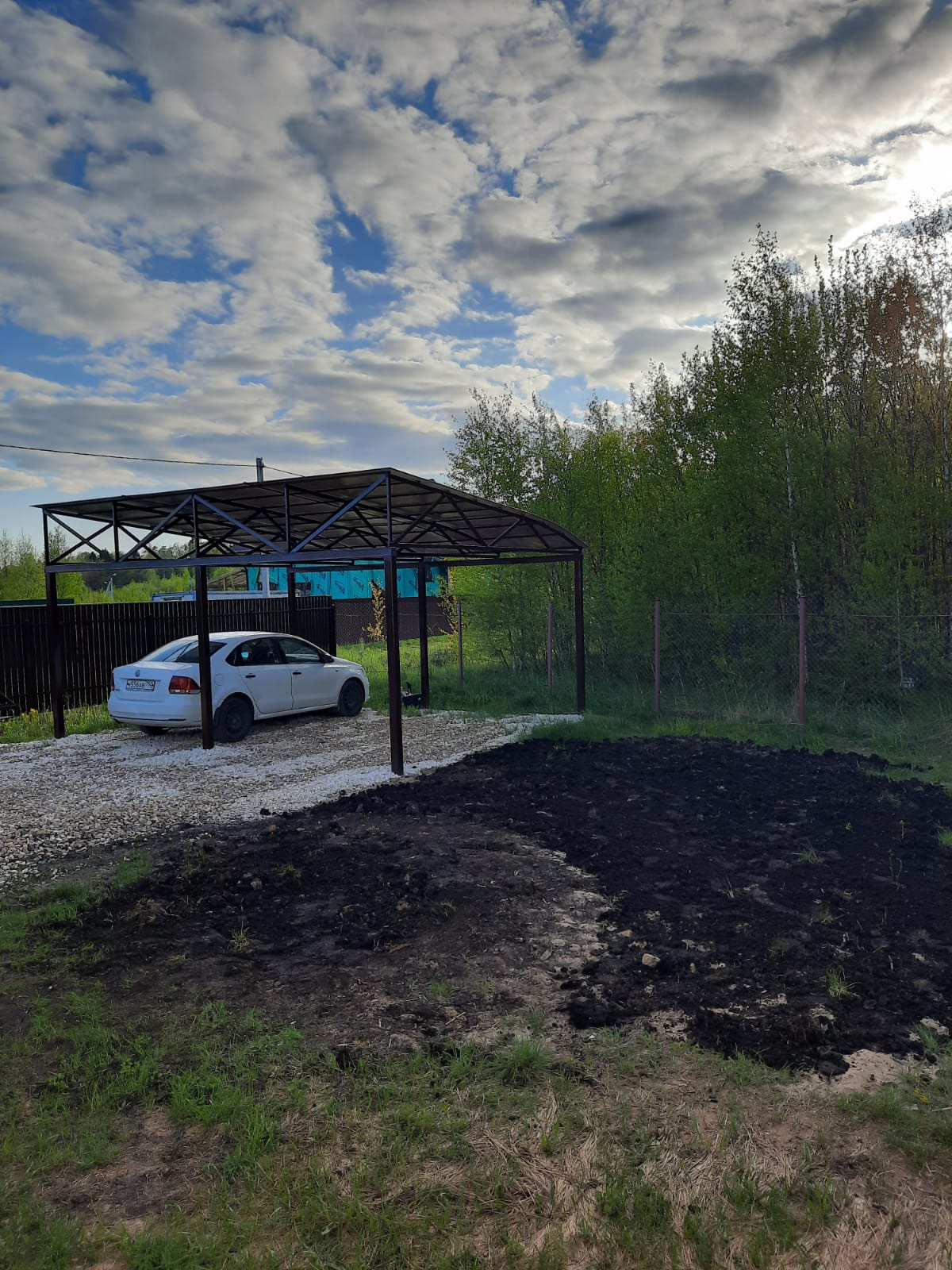 Участок 10 соток обработан, огорожен забором с откатными воротами, есть хозблок, навес для двух автомобилей.