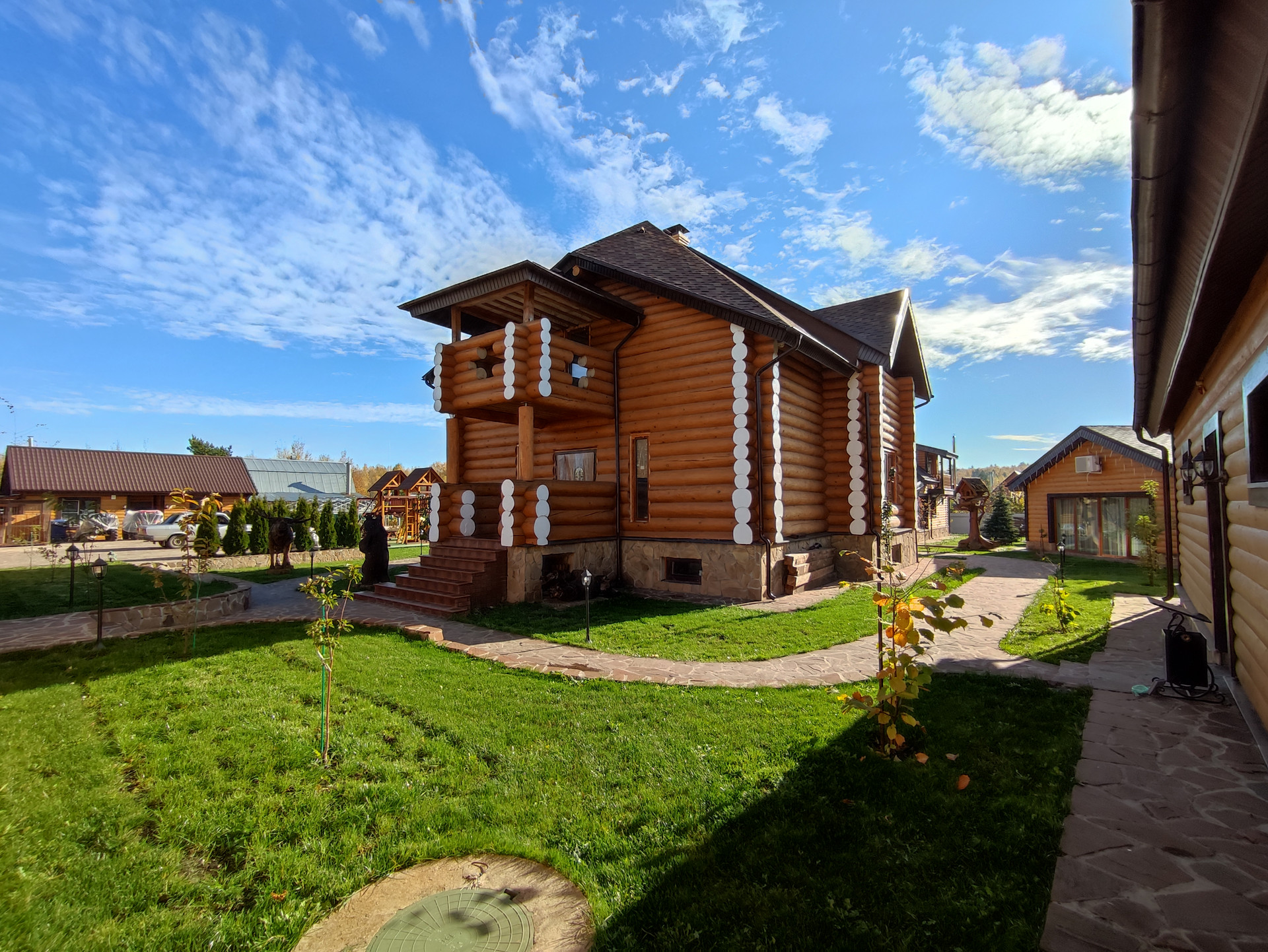 2-этажный дом, гараж-котельная (62,2 м2, 10,1 м2), беседка и банный комплекс с бассейном выполнены в едином архитектурном стиле, дополнительно на участке расположены две хозяйственные постройки (62,2 м2 и 36,7м2).
