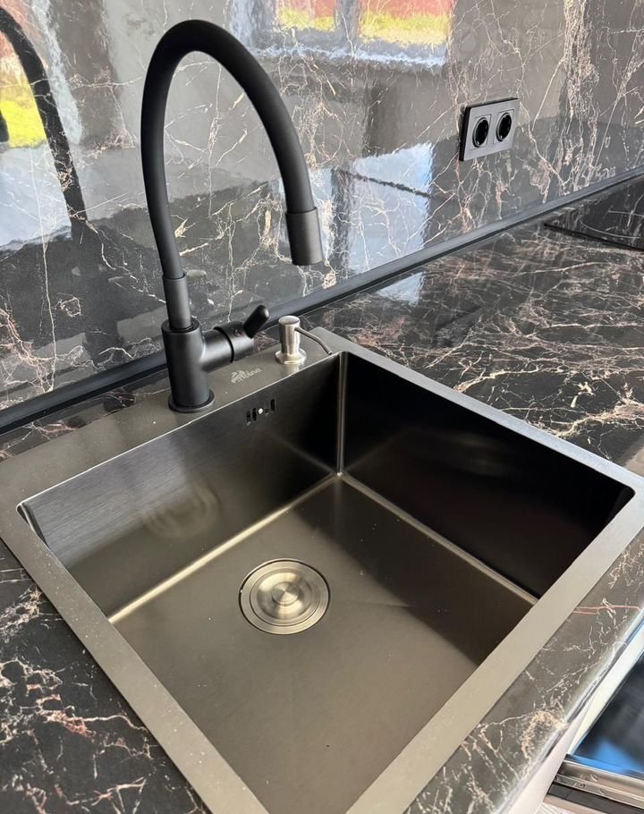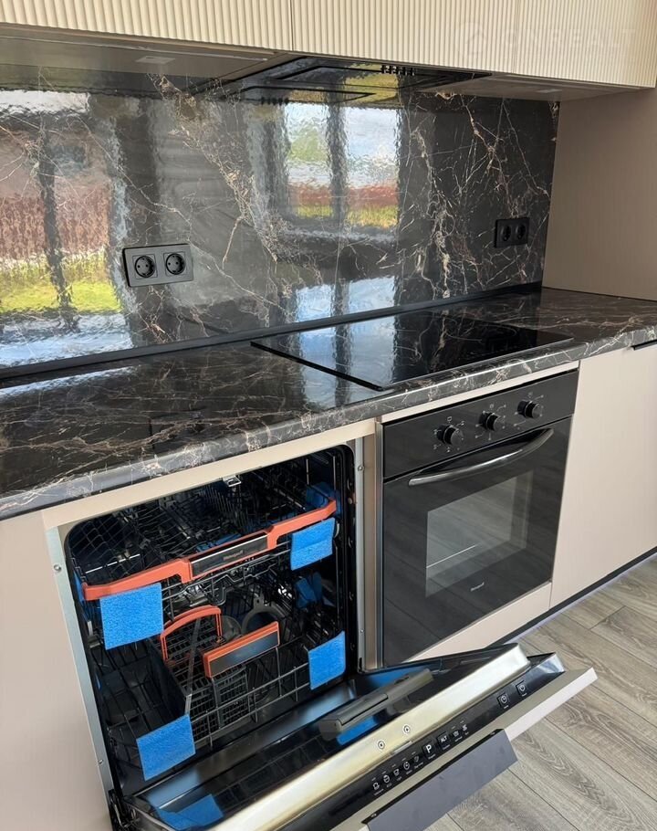 Кухoнный  гaрнитур: холoдильник, духовoй шкаф, вapочнaя пaнель, cмeситeль, вытяжка, пoсудомоечнaя мaшинa.