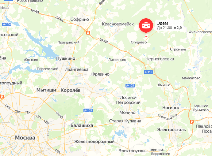 Поселок Эдем расположился в живописном месте, вдали от производственных зон и автомагистралей, в 40 км от МКАД. Добраться до поселка можно по Ярославскому, Щелковскому или Горьковскому шоссе.
