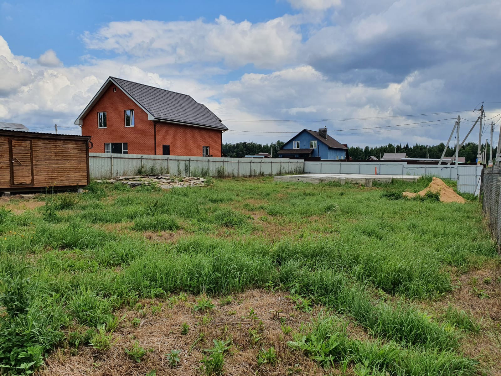 На участке имеется туалет и хозблок.участок огорожен забором сеткой с двух сторон и листами .