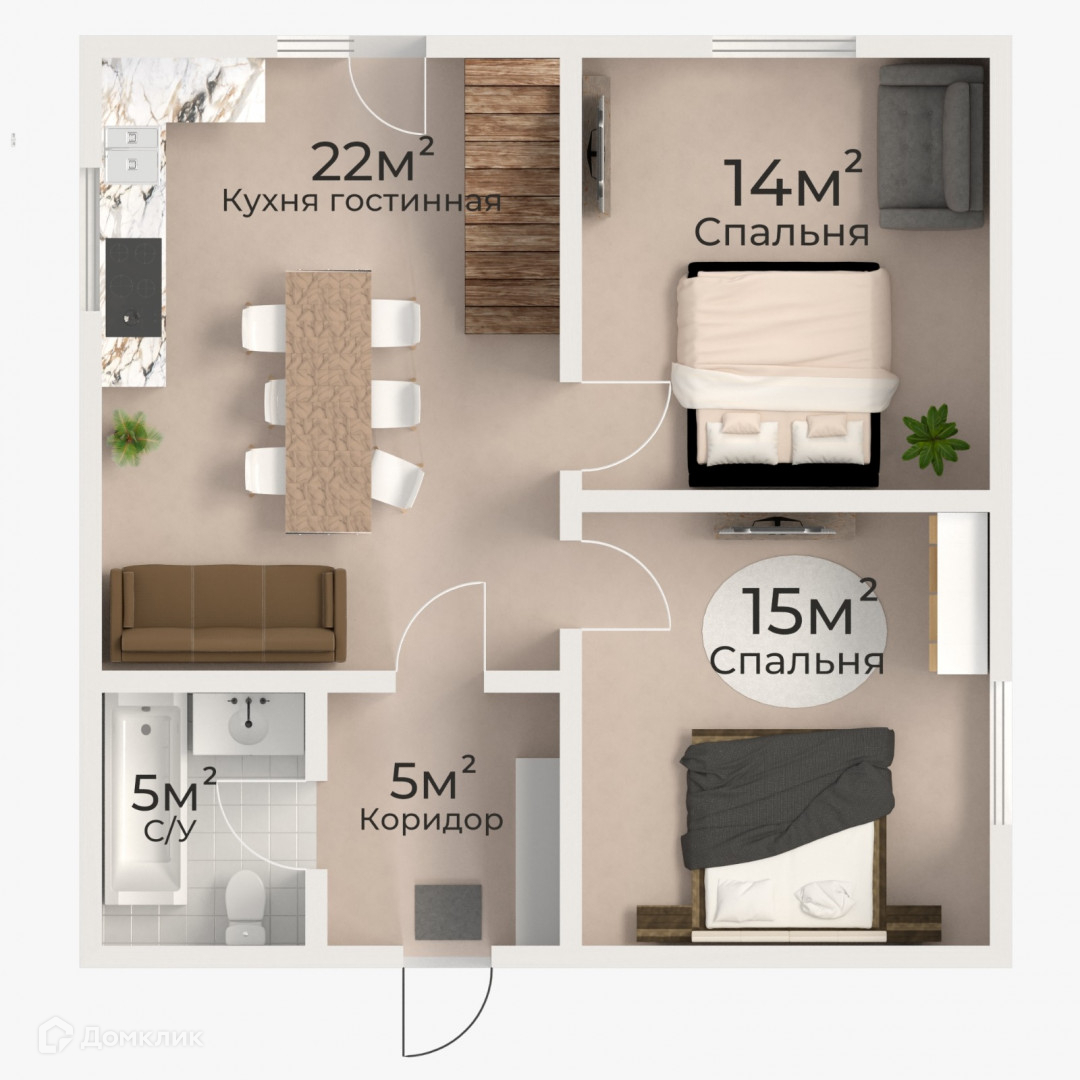 Кухня-гостинная + 2 спальни: